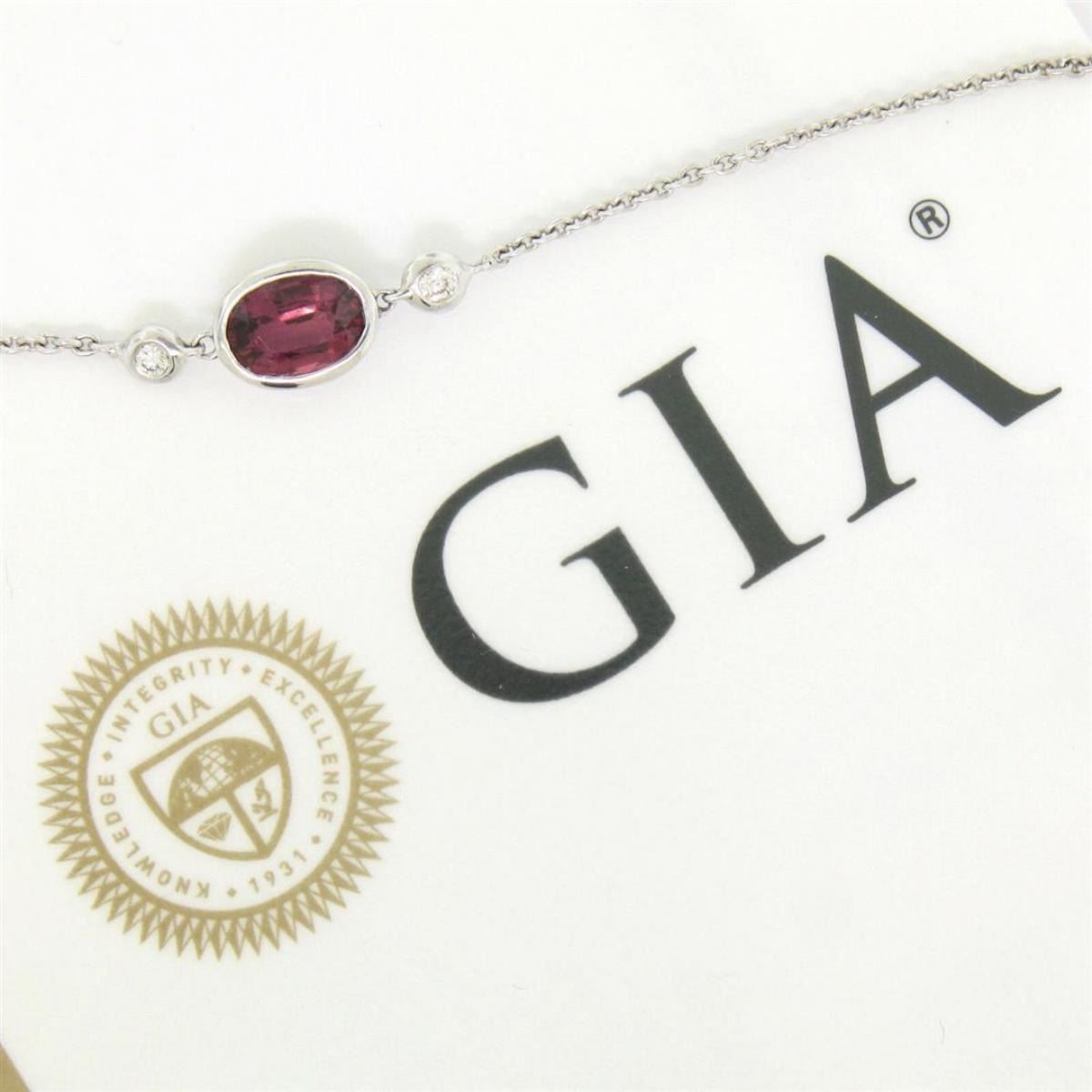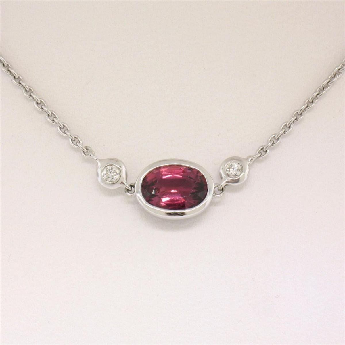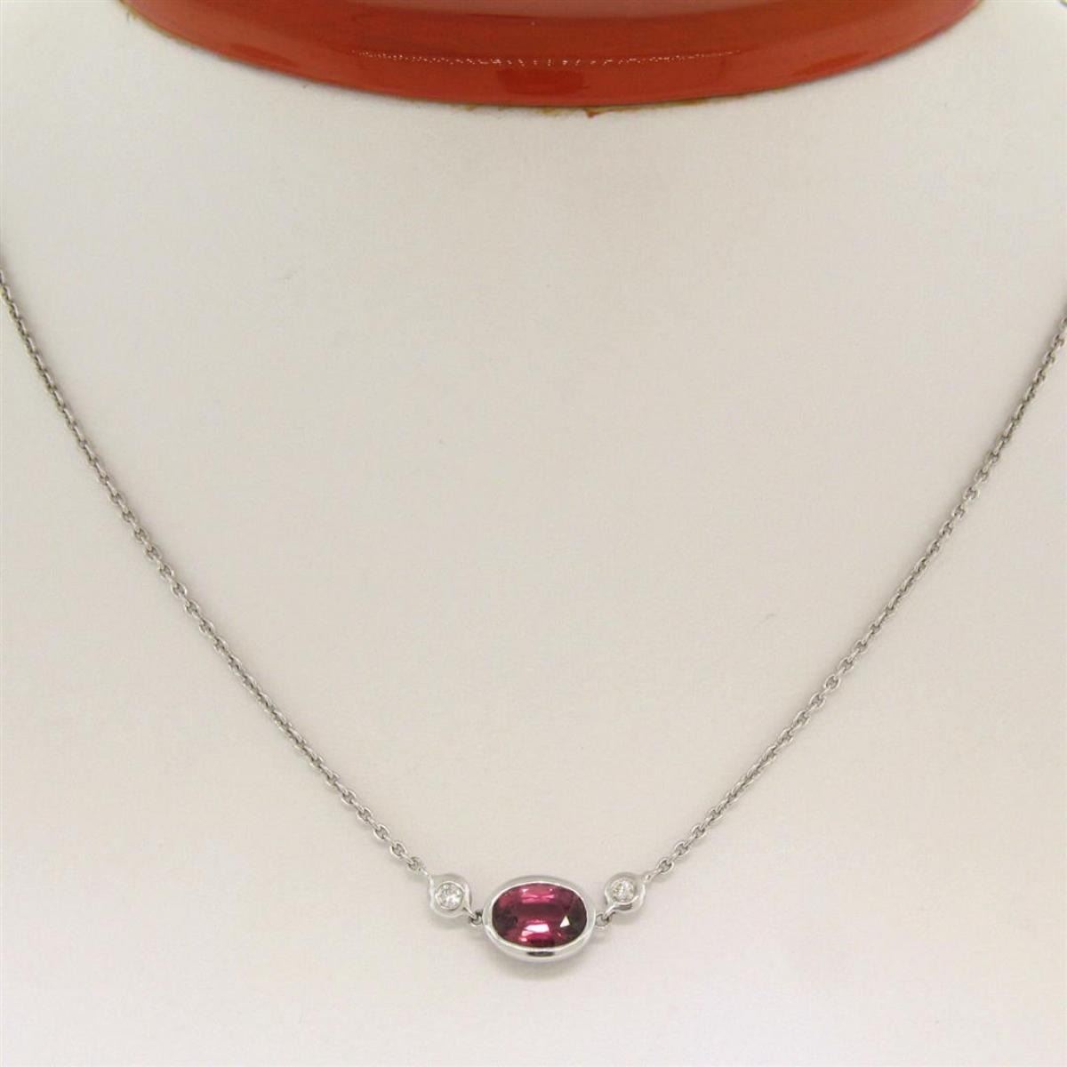 A new 18kt white gold pendant necklace featuring a GIA certified 1.07ct oval pink sapphire accented by 2 round brilliant diamonds (G / VS1). 16 inch cable link chain, 4.48 grams total weight, measures 21.0x7.2mm.