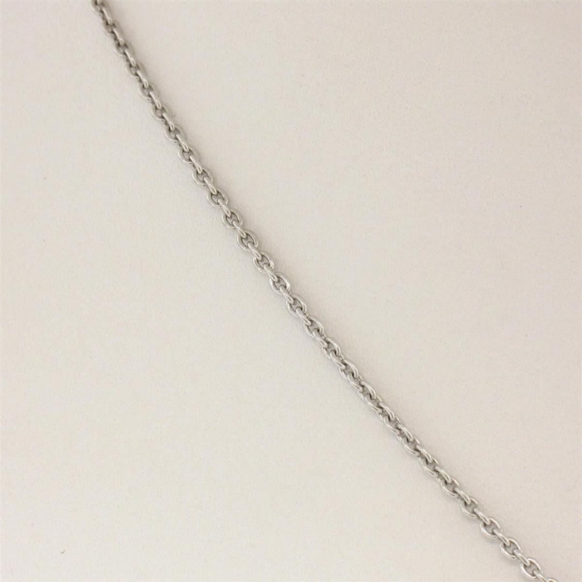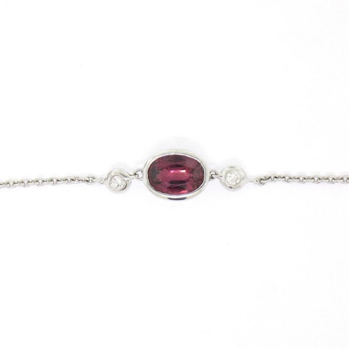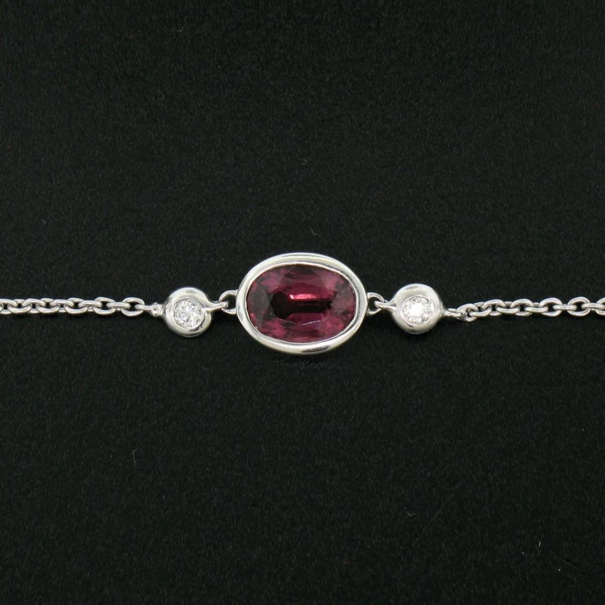 A new 18kt white gold pendant necklace featuring a GIA certified 1.07ct oval pink sapphire accented by 2 round brilliant diamonds (G / VS1). 16 inch cable link chain, 4.48 grams total weight, measures 21.0x7.2mm.