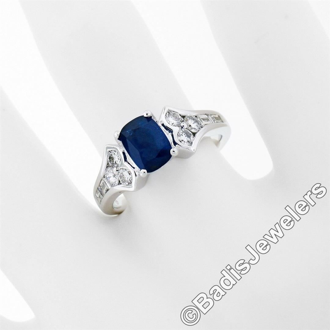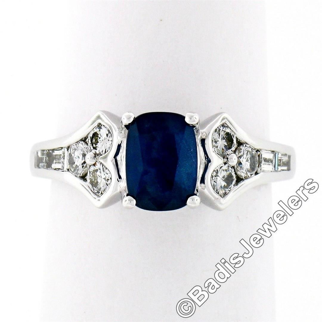 A new 18kt white gold ring featuring a 1.03ct cushion cut sapphire prong set between two tulip motifs set with 0.64ctw of round brilliant and baguette cut diamonds (E/F - VS1). The ring is size 6.5, weighs a total of 5.03 grams, and measures 7.2mm wide.