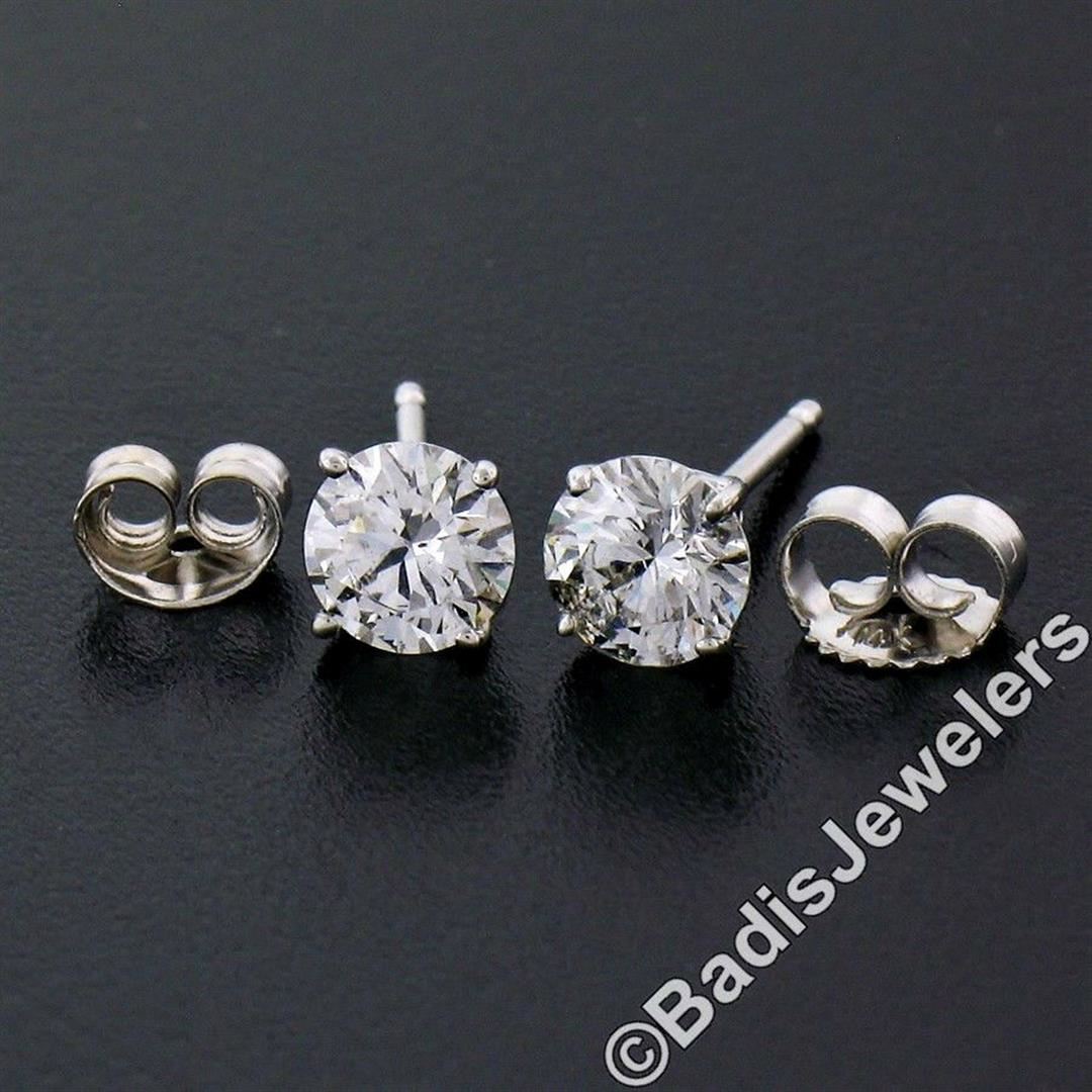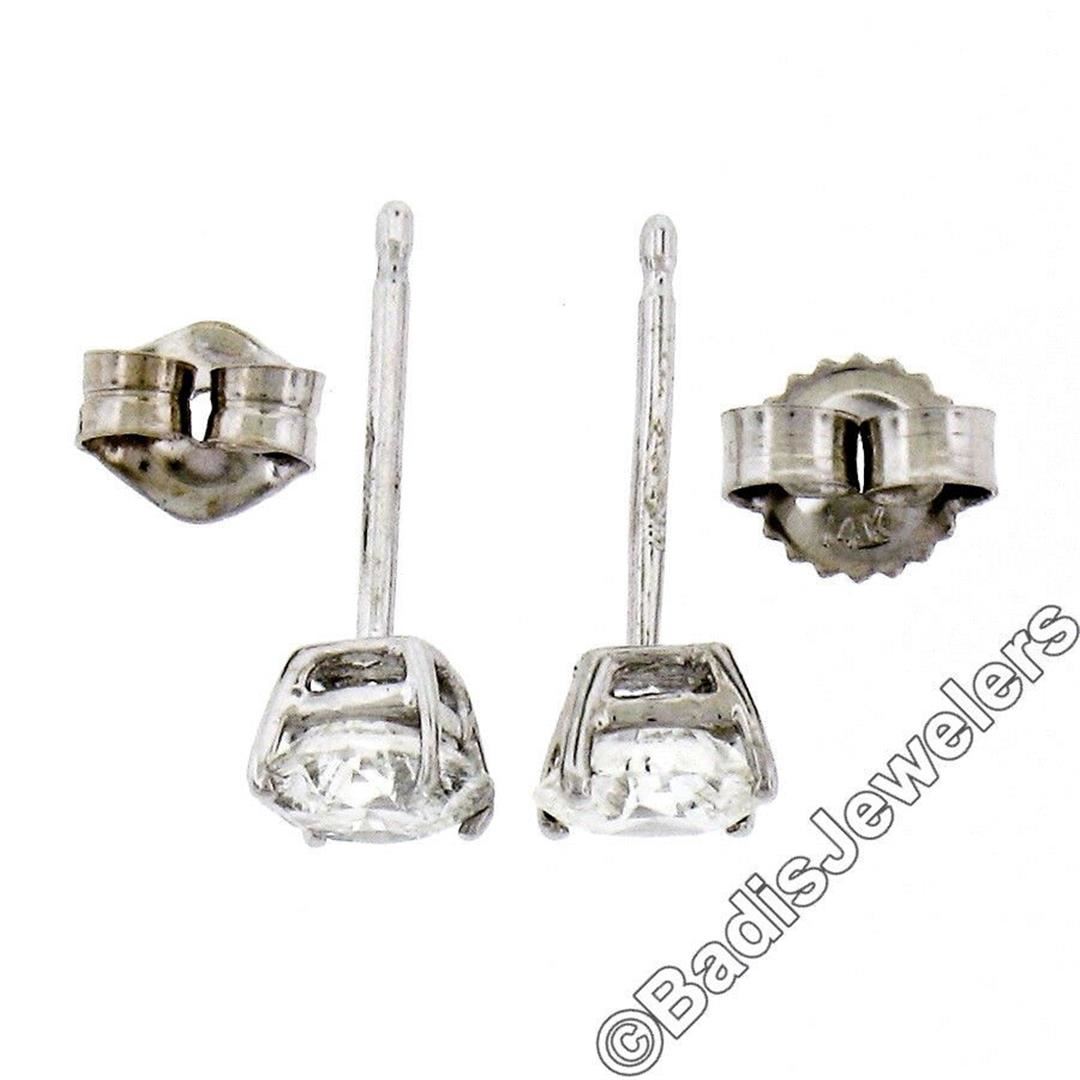 A new pair of classic 14kt white gold stud earrings featuring a well matched pair of round brilliant cut diamonds (F/G - SI1/SI2; 0.75ctw). The earrings measure approximately 5.65mm in diameter and weigh a total of 0.67 grams.