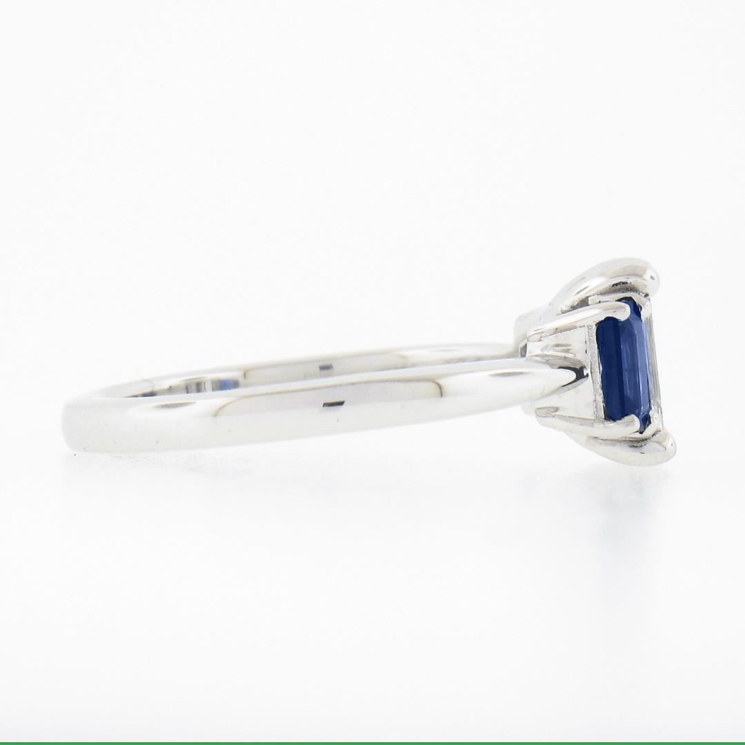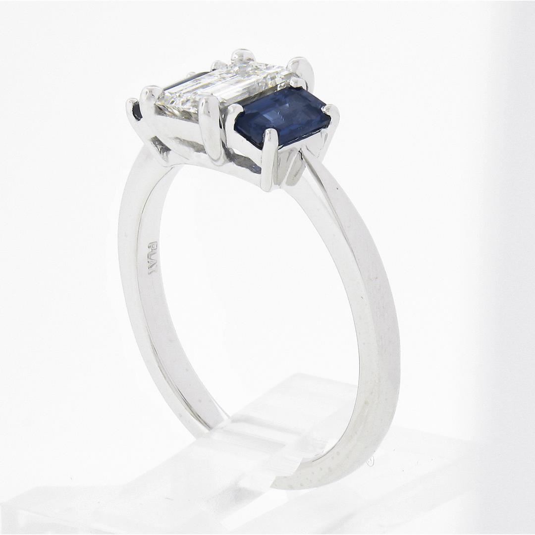 A new platinum 3 stones engagement ring, featuring 1 GIA graded emerald cut natural diamond (G - VS1 ; 0.91ct), and 2 emerald cut natural sapphires (0.80ctw). The ring is size 6.5, weighs a total of 5.13 grams, and measures 7.90mm wide. Comes with all original relevant certifications.