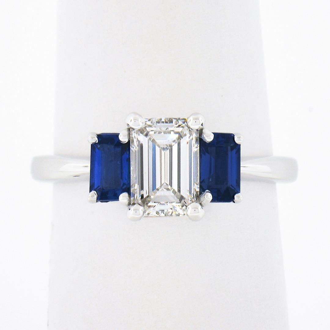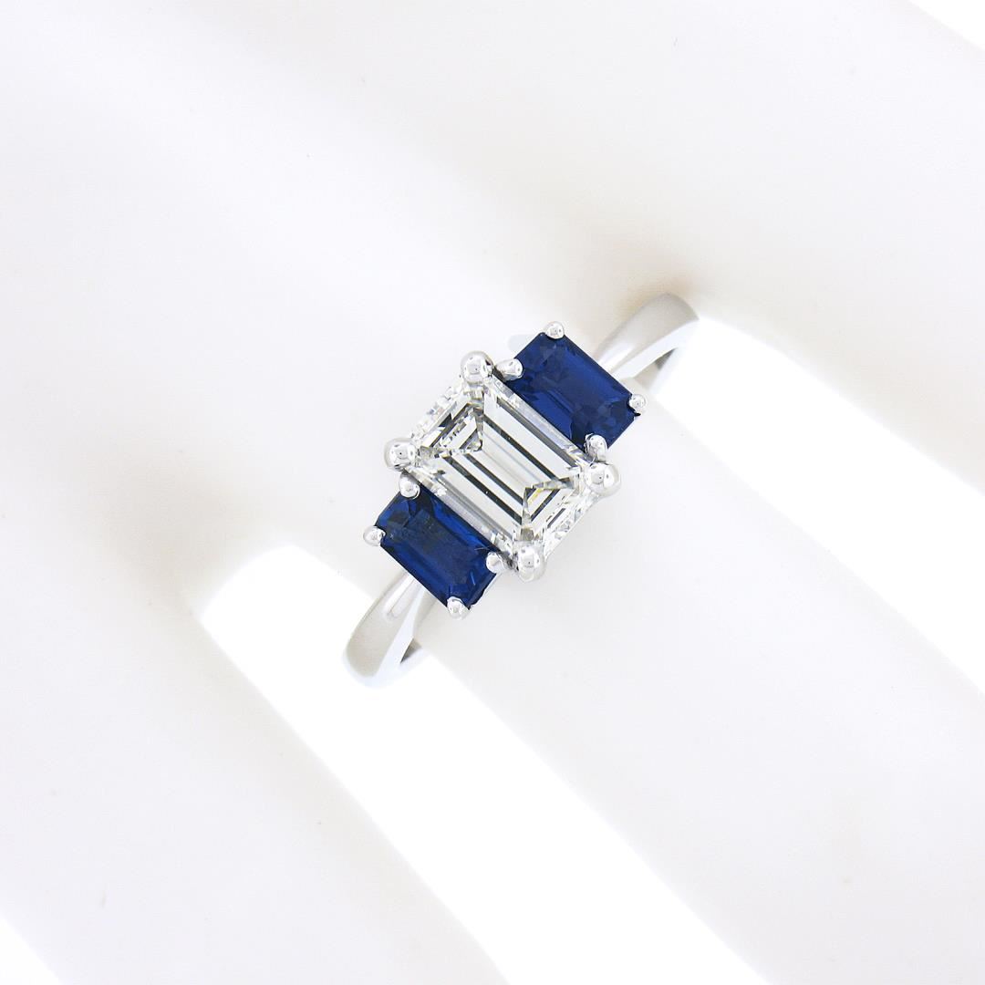 A new platinum 3 stones engagement ring, featuring 1 GIA graded emerald cut natural diamond (G - VS1 ; 0.91ct), and 2 emerald cut natural sapphires (0.80ctw). The ring is size 6.5, weighs a total of 5.13 grams, and measures 7.90mm wide. Comes with all original relevant certifications.