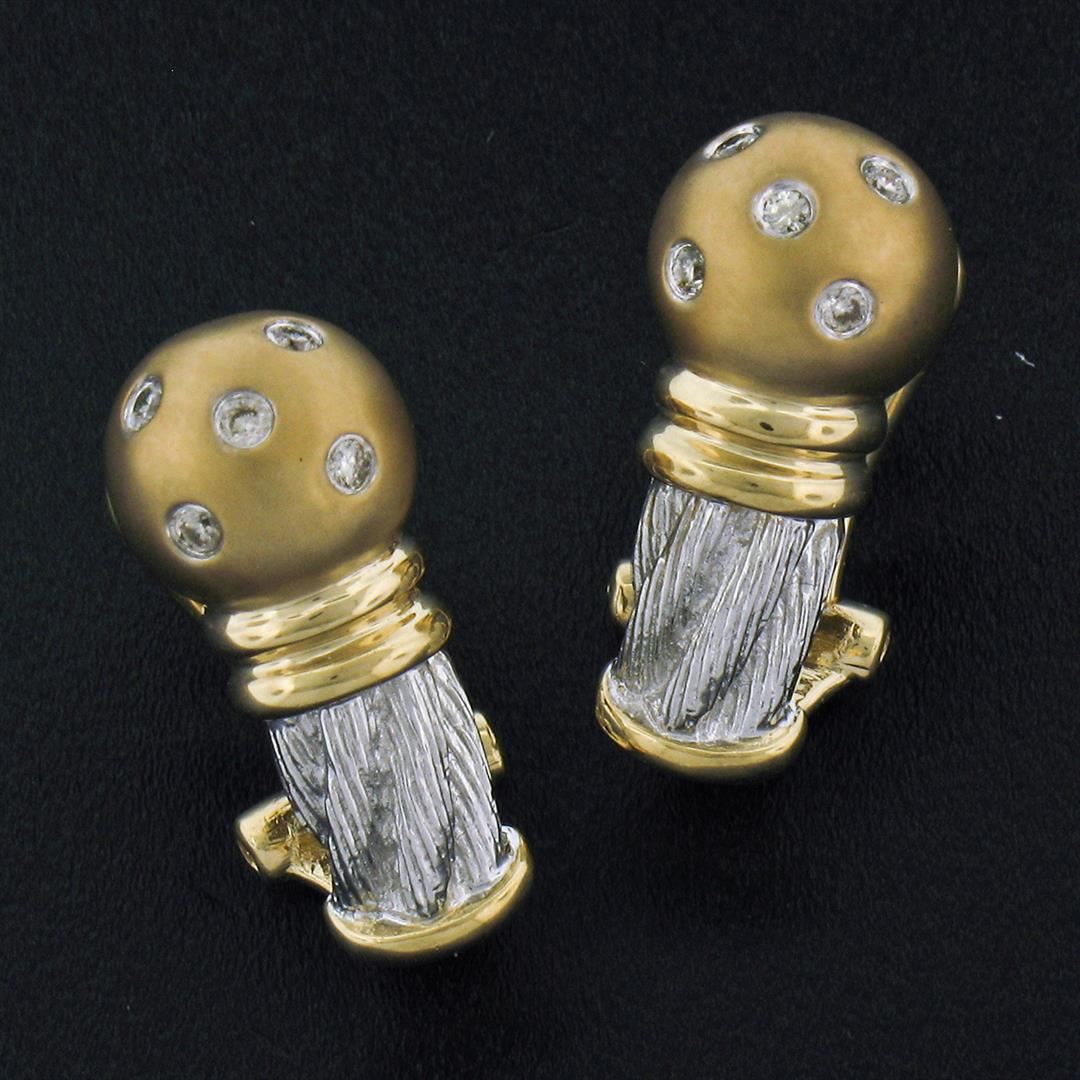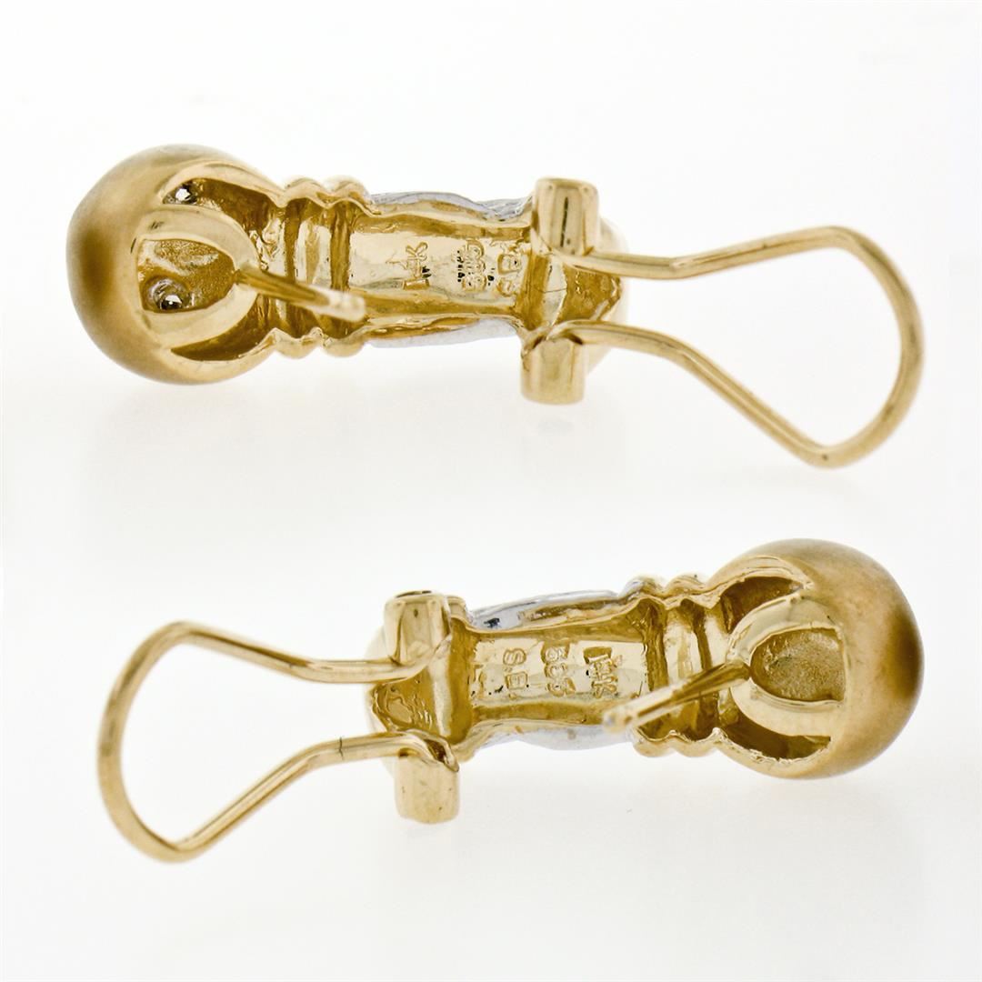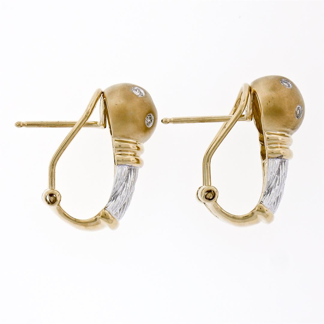New Unique 14K TT Gold .20ctw Round Diamond Textured Brushed Omega Back Earrings. Please see photos and description for all available information. a new solid 14k yellow and white gold brushed earrings, with 10 round brilliant cut natural diamonds (G/H- VS2; 0.20ctw). The earrings measure approximately 20.0x8.85mm and weigh a total of 6.43 grams.