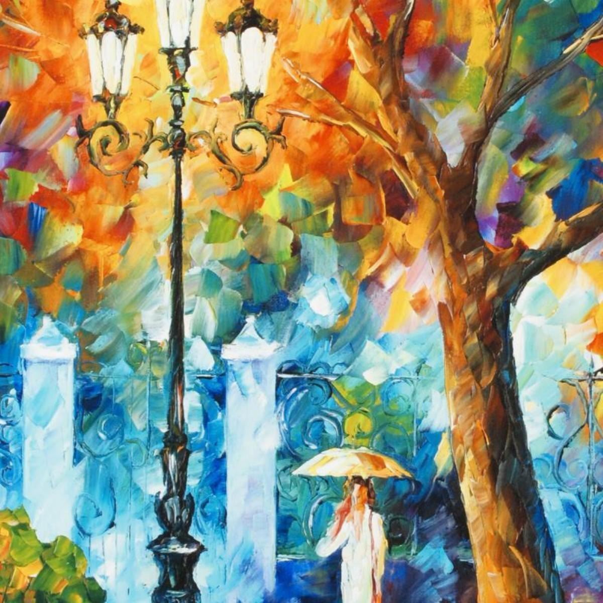 Leonid Afremov's (1955-2019) masterful use of color and texture make his paintings unique collectibles that are sure to brighten any wall. "Night Aura" is a limited edition giclee on canvas. The piece is numbered and bears the artist's authorized signature. This piece comes gallery wrapped. Includes Letter of Authenticity. Measures approx. 18" x 24" (image).