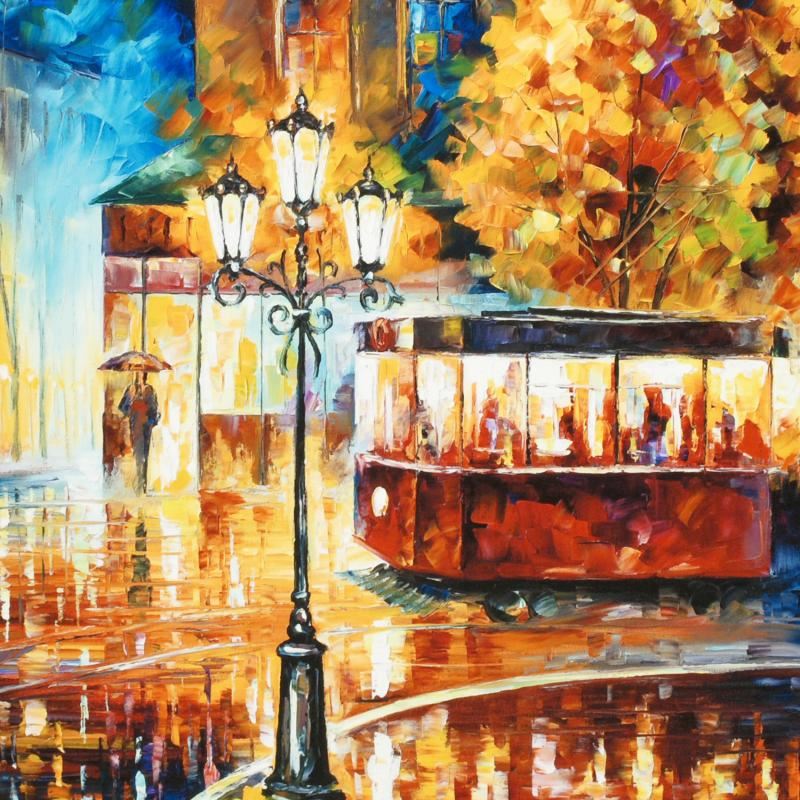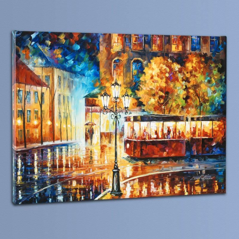 Leonid Afremov's masterful use of color and texture make his paintings unique collectibles that are sure to brighten any wall. "Night Trolley" is a limited edition giclee on stretched canvas, numbered and bears Afremov's authorized signature. This piece comes gallery wrapped. Includes Certificate of Authenticity! Measures approx. 24" x 18" (image).