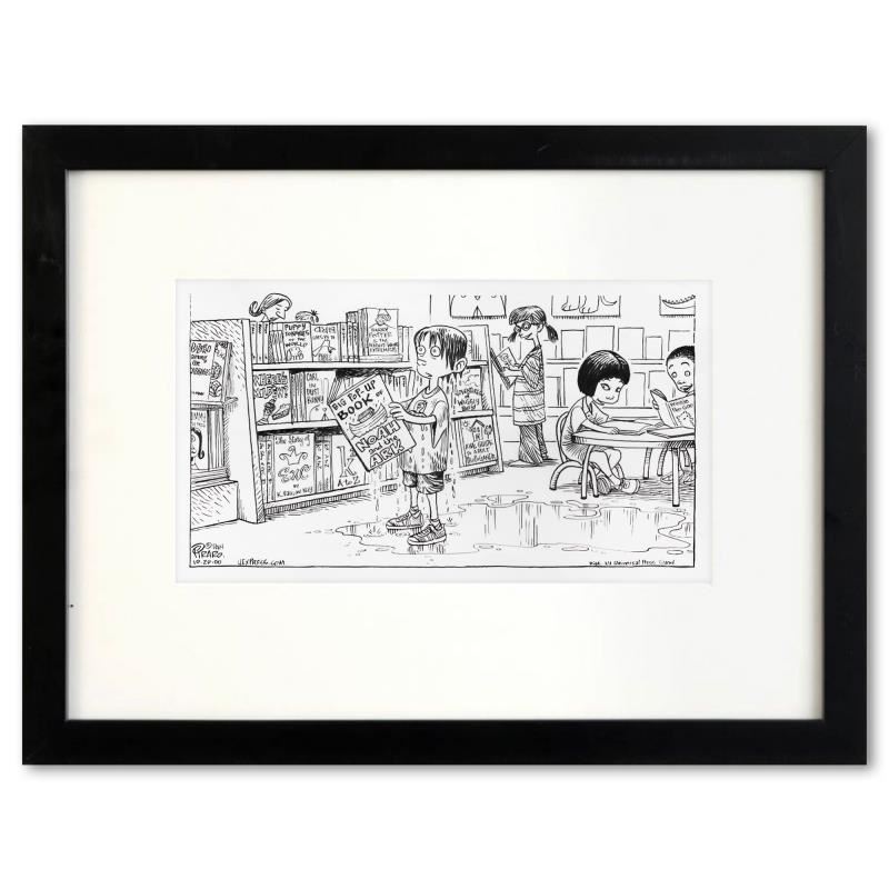Enter a surreal and satirical world of twisted imagination and award winning creativity. Noah's Ark Pop-Up is an original pen & ink drawing on paper by Dan Piraro, creator of the critically acclaimed and award winning comic strip, Bizarro. This piece is hand signed, comes custom framed and includes a letter of authenticity. Measures approximately 14 x 21 (frame), 7 x 13 (image).This item requires special handling and may have a longer than usual turnaround.