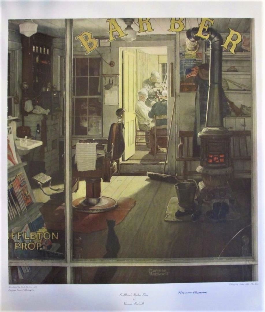 Norman Rockwell "Suhuffelton's Barber Shop" Facsimile Signed, Limited Edition Numbered Lithograph Dimensions: 34.5 x 30 inches (Note: edition number received may differ from photo)