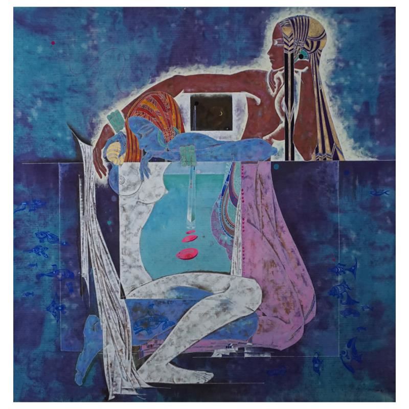 "Ocean Tale (1994)" is an original mixed media painting on paper by Lu Hong. Hand signed by the artist, the piece comes with a letter of authenticity. Measures approximately 35" x 34.5".