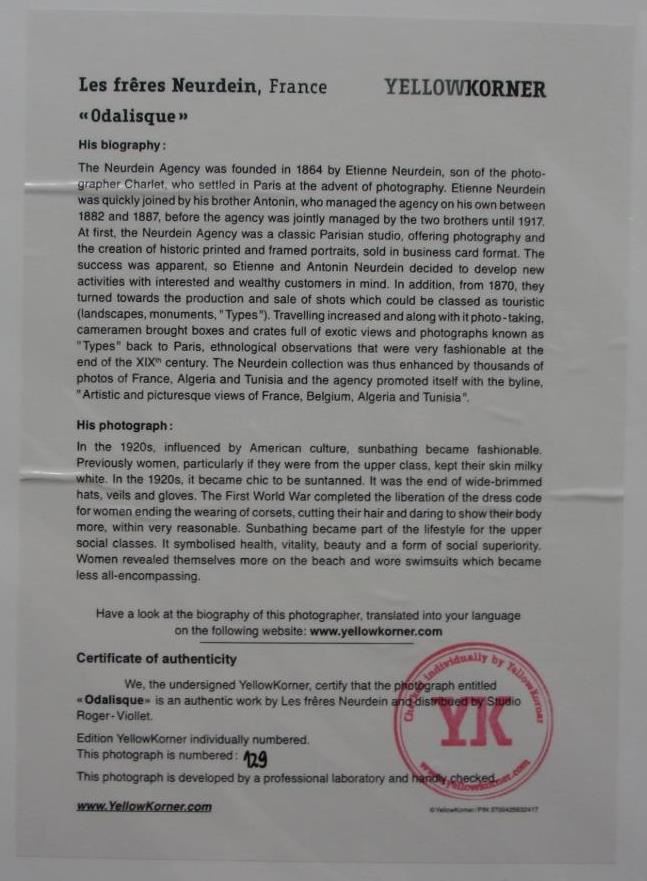 Odalisque Certified Photograph, Les Freres Neurdein YellowKorner Certified Photograph. Certificate of Authenticity from YellowKorner affixed to the back. Matted Dimensions 16"x20". Protected with Clear Mylar Sleeve.