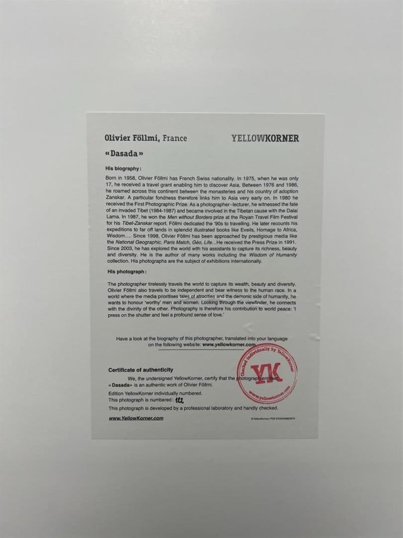 Olivier Follmi France Dasada YellowKorner Certified Photograph. Certificate of Authenticity from YellowKorner affixed to the back. Matted Dimensions 16"x20". Protected with Clear Mylar Sleeve.