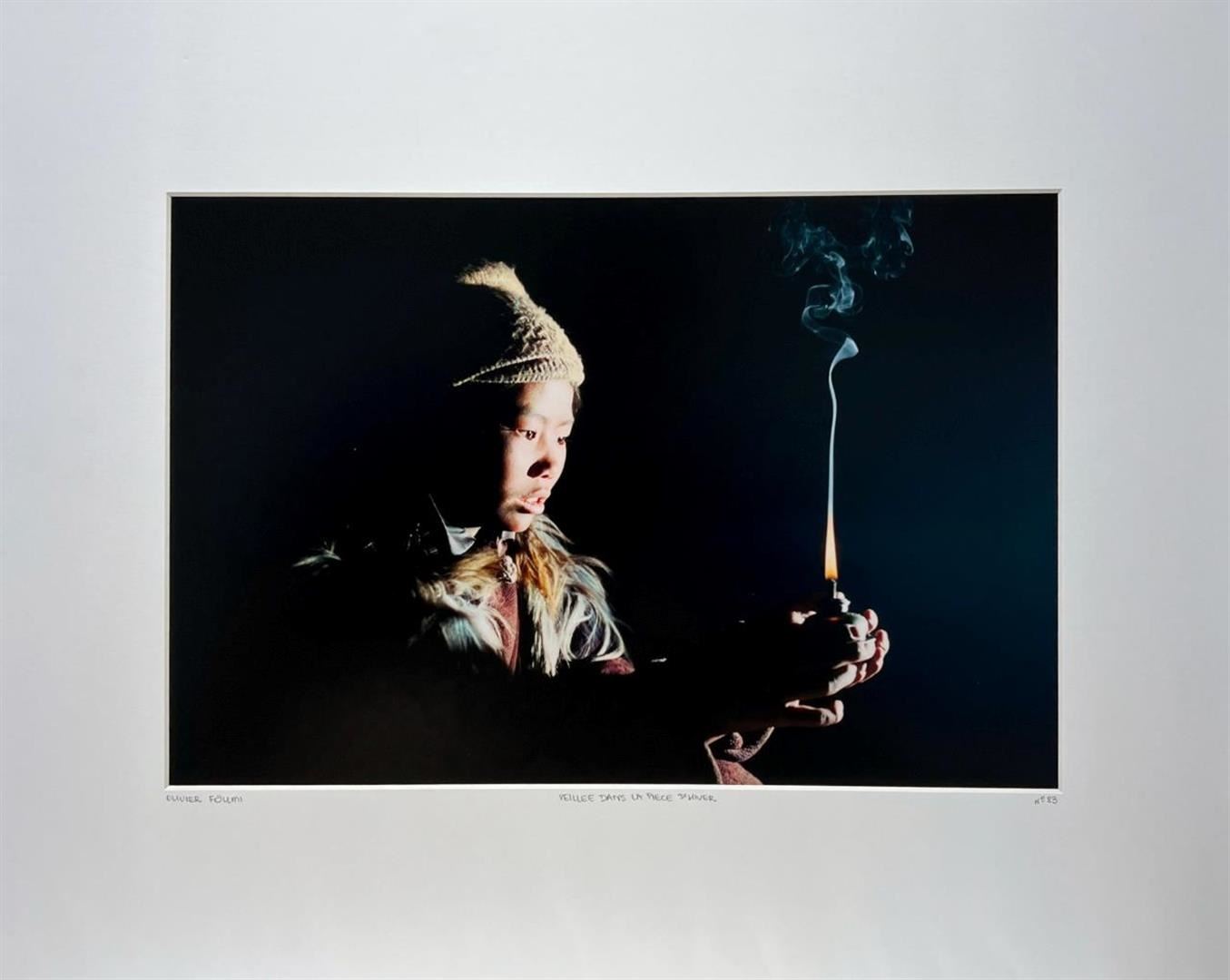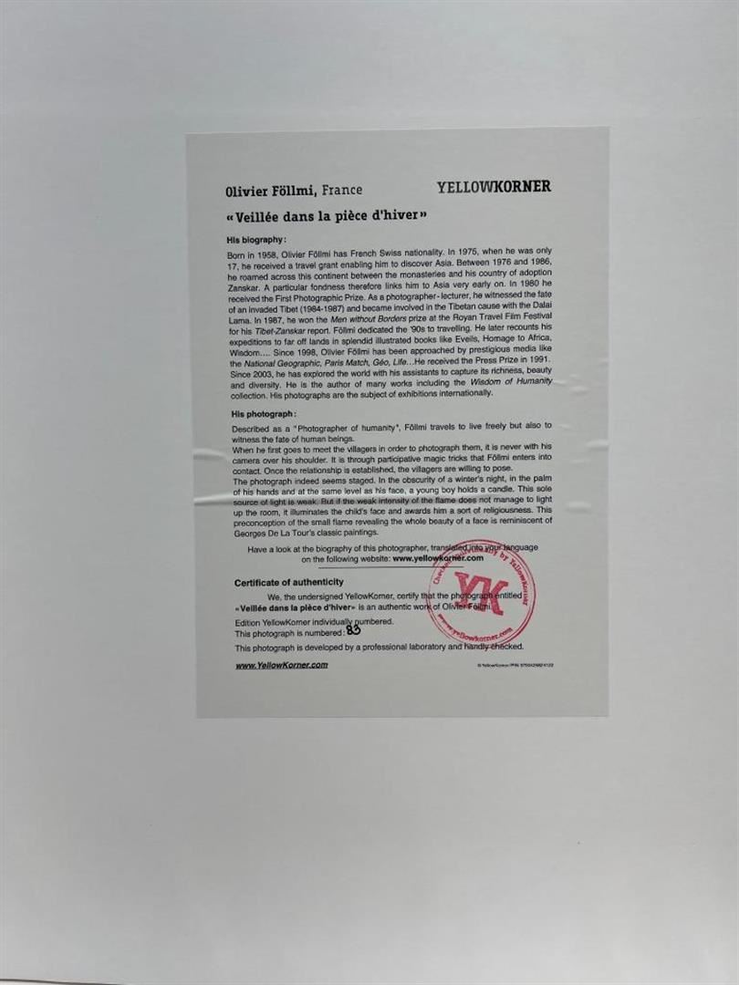 Olivier Follmi France Veillee dans la piece D hiver YellowKorner Certified Photograph. Certificate of Authenticity from YellowKorner affixed to the back. Matted Dimensions 16"x20". Protected with Clear Mylar Sleeve.