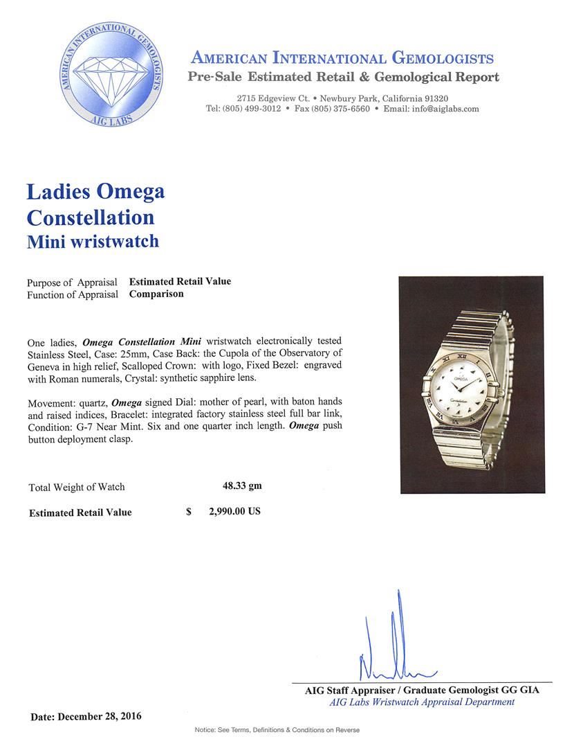 One ladies, Omega Constellation Mini wristwatch electronically tested Stainless Steel, Case: 25mm, Case Back: the Cupola of the Observatory of Geneva in high relief, Scalloped Crown: with logo, Fixed Bezel: engraved with Roman numerals, Crystal: synthetic sapphire lens. Movement: quartz, Omega signed Dial: mother of pearl, with baton hands and raised indices, Bracelet: integrated factory stainless steel full bar link, Condition: G-7 Near Mint. Six and one quarter inch length. Omega push button deployment clasp. Total Weight of Watch 48.33gm. AIG Appraised at $2,990.00.