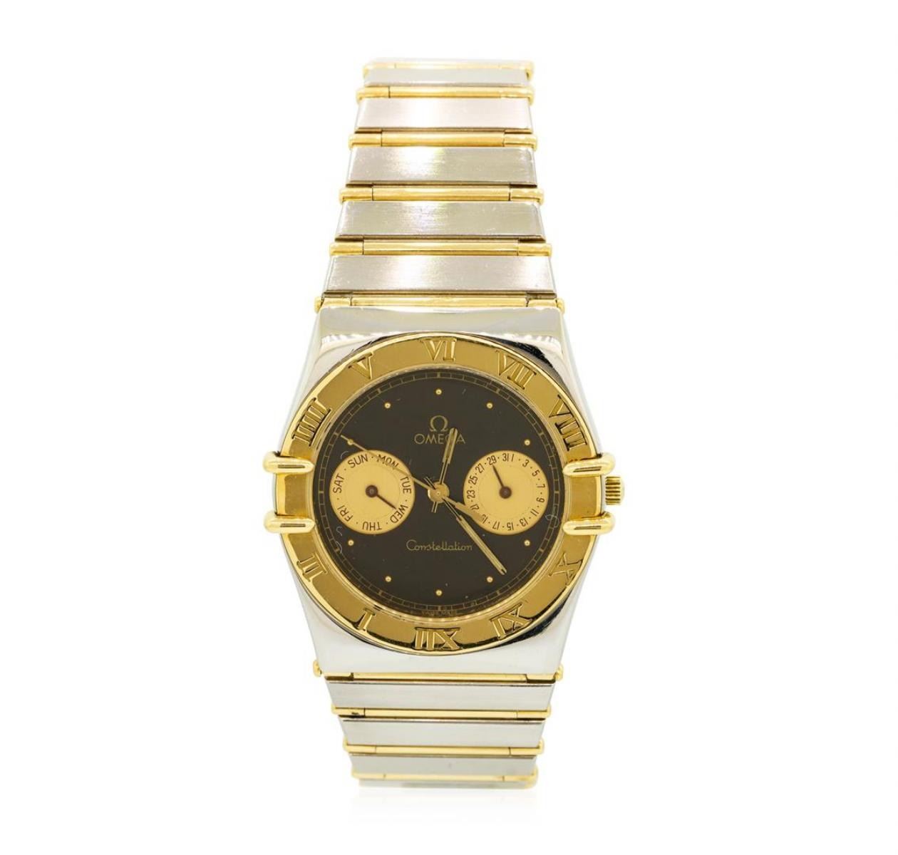 One, Omega two-tone Constellation wristwatch electro-chemically tested.Stainless Steel Case: 34mm, Case Back: engraved with the Cupola of the Observatory of Geneva, 18KT yellow gold Crown: scalloped with high relief Omega logo, 18KT Yellow gold Fixed Bezel: engraved with Roman numerals, Crystal: synthetic sapphire lens.Movement: quartz, Omega signed Dial: Black color, with luminous hands and indices, Gold color Sub Dials: one for weekdays and one for the date. Omega Bracelet: integrated factory stainless steel & 18KT yellow gold full bar link, Condition: G-5 Fine. Seven and one half inch length, with a push button deployment clasp. Total Weight of Watch 79.21gm. AIG Appraised.