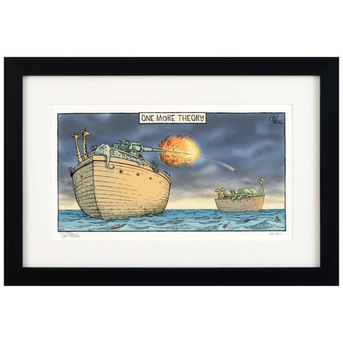 Enter a surreal and satirical world of twisted imagination and award winning creativity. "One More Theory" is a limited edition giclee on paper by Dan Piraro, creator of the critically acclaimed and award winning comic strip, Bizarro! This piece is framed, numbered and hand signed by the artist! Includes Certificate of Authenticity! Measures approx. 22" x 15" (with frame), 15" x 8" (image).