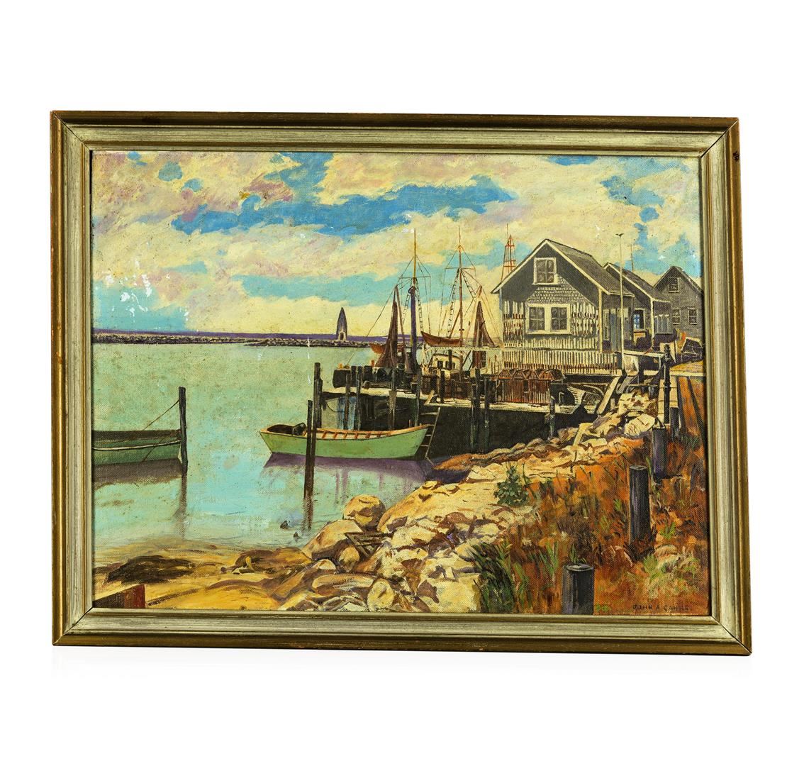 This original oil painting features an east coast harbor with sailboats, docks, and autumn colors. Beautifully executed, original frame measuring 18" x 14".