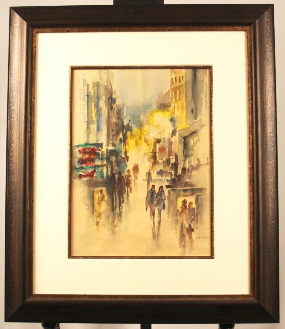 Original watercolor of city street - mid century modern artist Hoe Won measuring 14" x 19" unframed and 27" x 33" framed. Framed in gorgeous bronze washed frame with crème matt and bronze filet. Signed lower right. Valued between $1,700-$2,000.