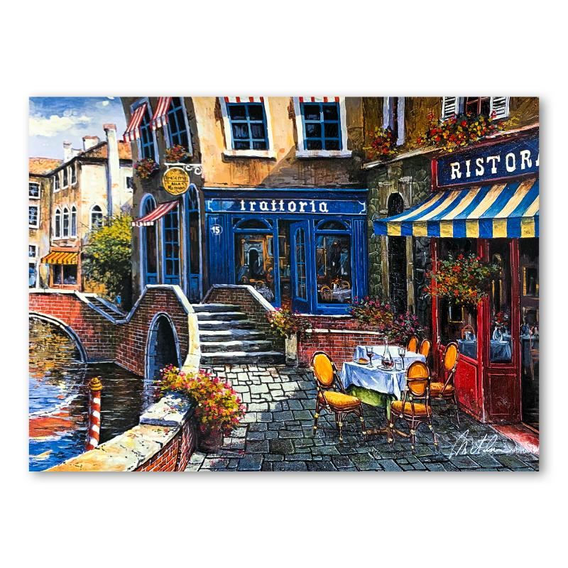 "Outdoor Cafe" is a limited edition serigraph on paper by Anatoly Metlan. It is numbered and hand signed and includes a letter of authenticity. Measures approximately 8.5" x 11.5" (image).