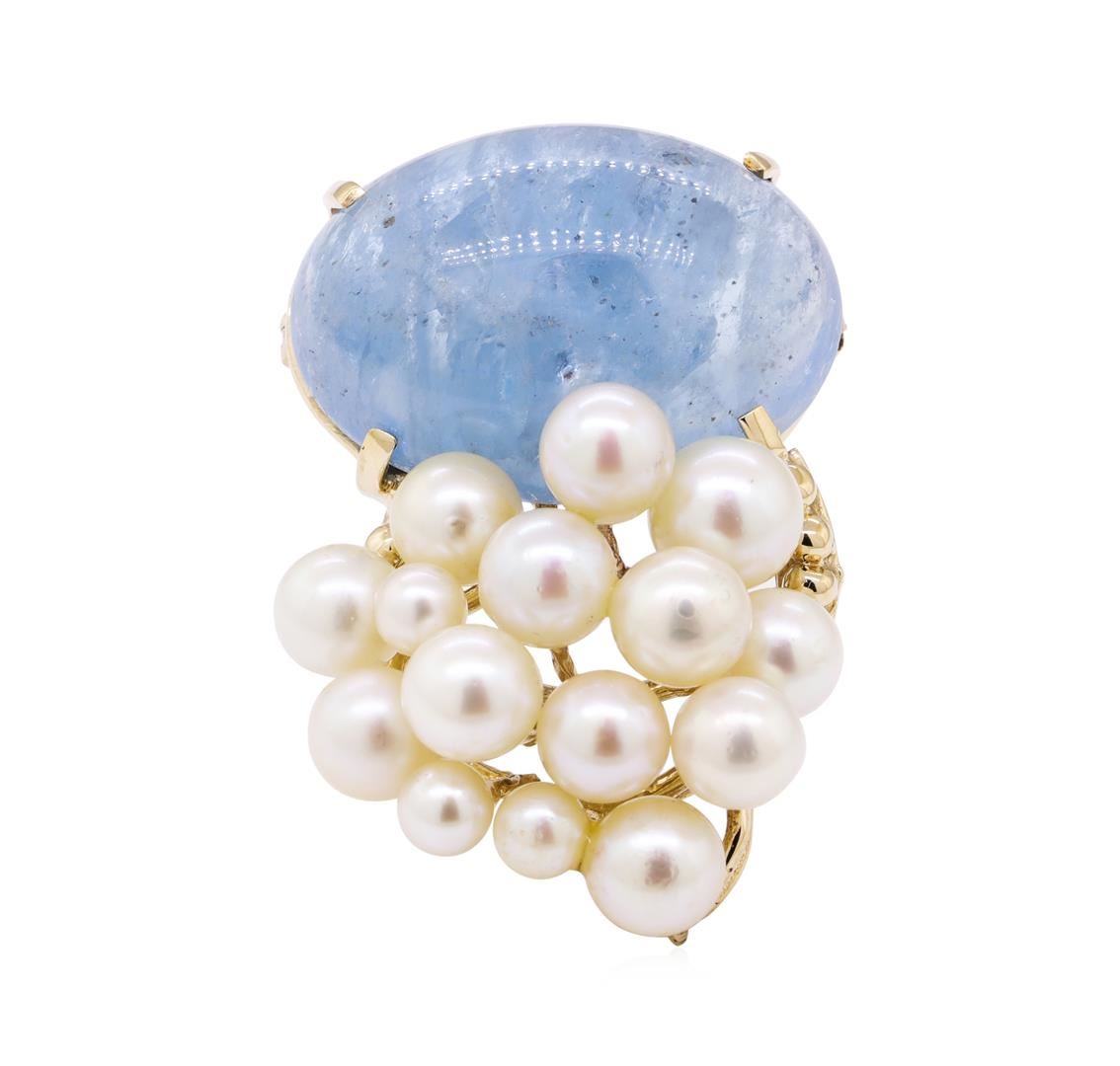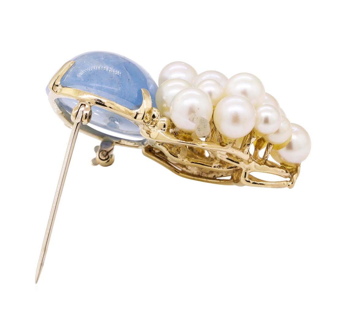 One pearl cluster pendant/pin featuring: 14KT yellow gold weighing 18.8 grams containing one oval shaped cabochon cut kyanite and a cluster of Akoya cultured pearls.