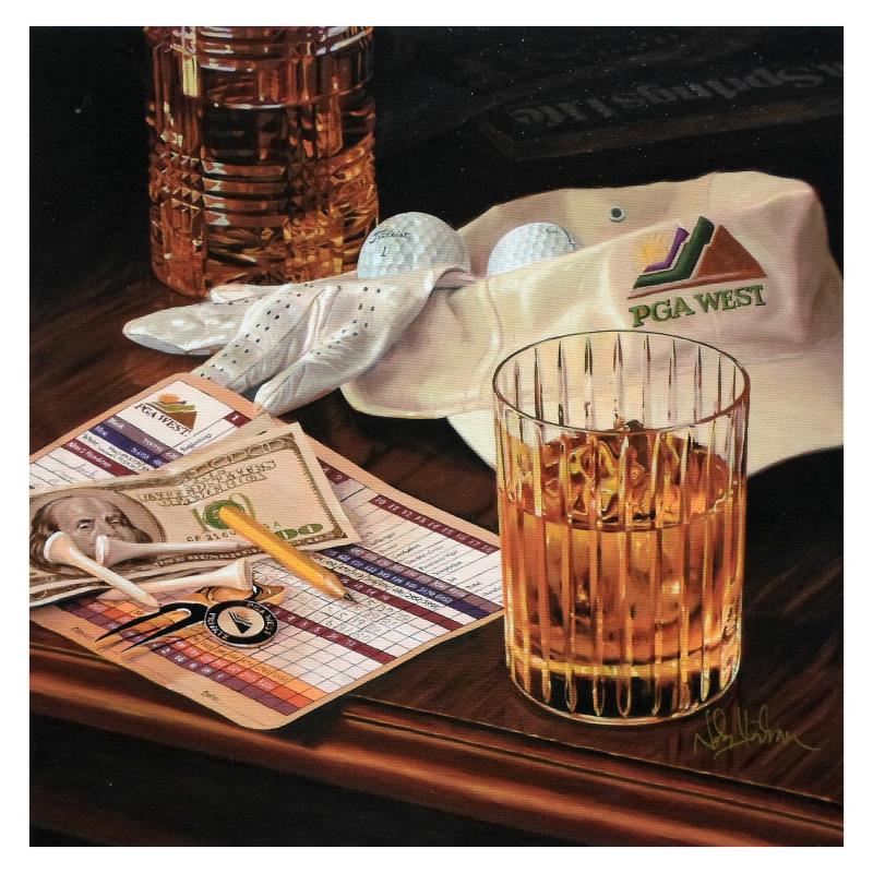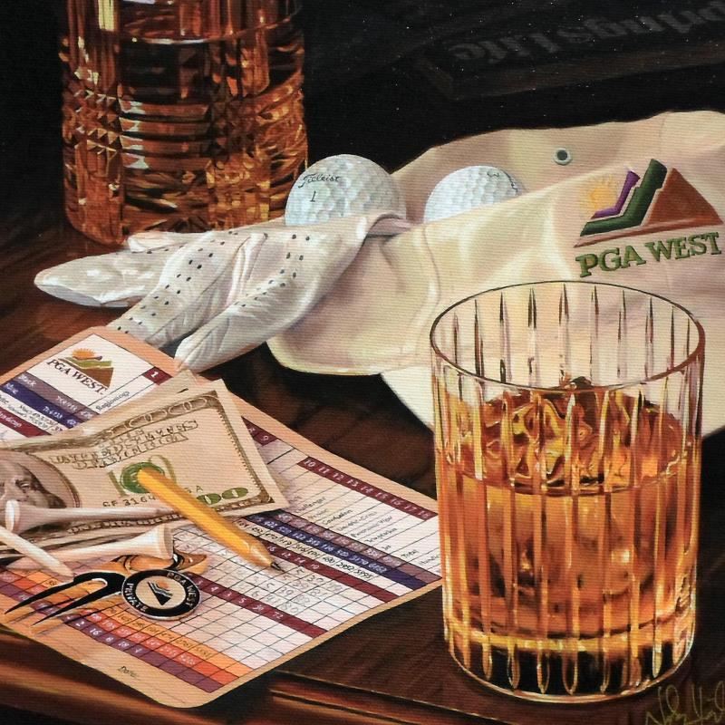 "P.G.A.West" is a numbered limited edition giclee on canvas by Nobu Hairara. It comes bearing the artist's authorized signature and with a Certificate of Authenticity. Measures approximately 11.25"x11.25" (image).