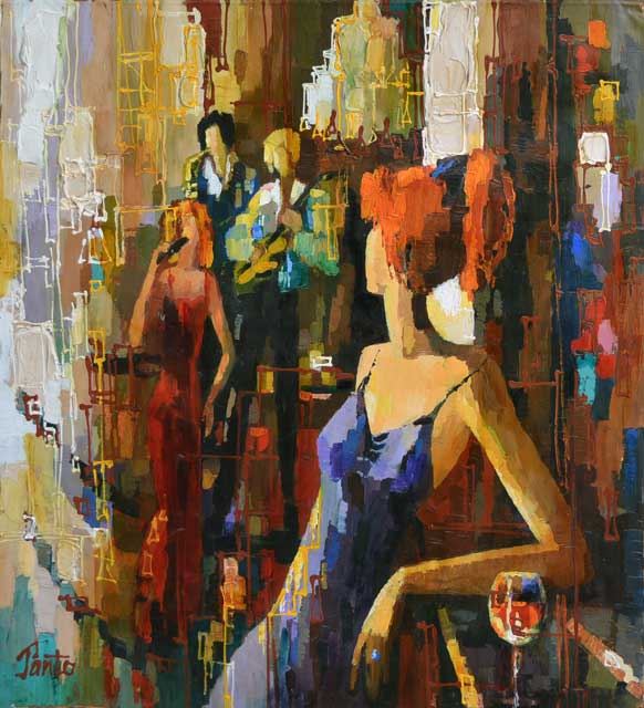Artist: Nelly Panto - Title: Enjoying the Music - Medium: Original Acrylic on Canvas - Signature: Hand-signed by the Artist - Image Size: Approximately 30 inches x 30 inches - Unframed on Unstretched Canvas - Details: This work comes with a Certificate of Authenticity - Biography: The contemporary art of Nelly Panto uses new achievements in the technology of art. In her recent paintings she combines different aspects of nightlife in the modern mega-city of our times. Flickering lights, deep shadows and rectilinear shapes are the vocabulary of her work. Panto uses sharp contrasts with density of color, to depict her modern heroes. Nelly Panto was born and raised in Kishenev, Moldova, where she graduated Art School and the local 'Art Academy'. She then worked as a book illustrator and designer. She illustrated the books of classical authors as Dostoevsky, Chekhov and Kuprin, deepening her understanding of human psychology. -