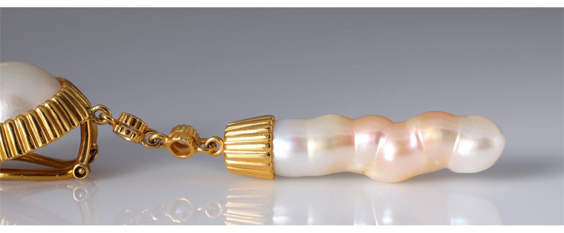 Pair 18K Yellow Gold Mabe & Baroque Pearl Earrings containing four round brilliant diamonds weighing approximately 0.40 cts. Total weight is 35.3 gm. Estimated retail value $3,500.