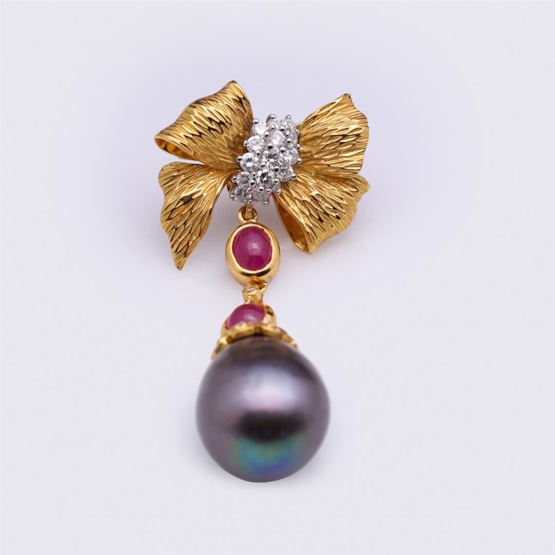 Pair of 18k yellow gold earrings by Carlo Rici; gold bows with center diamond clusters atop hanging chains, each set with two ruby cabochons and single diamond accent, terminating in diamond studded mounts holding large white and black pearls, earring bac