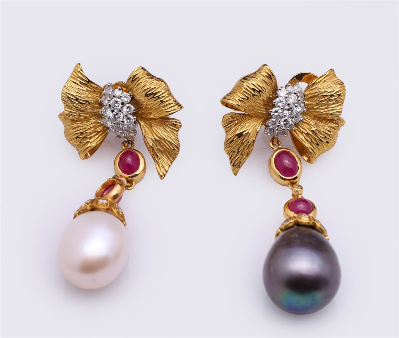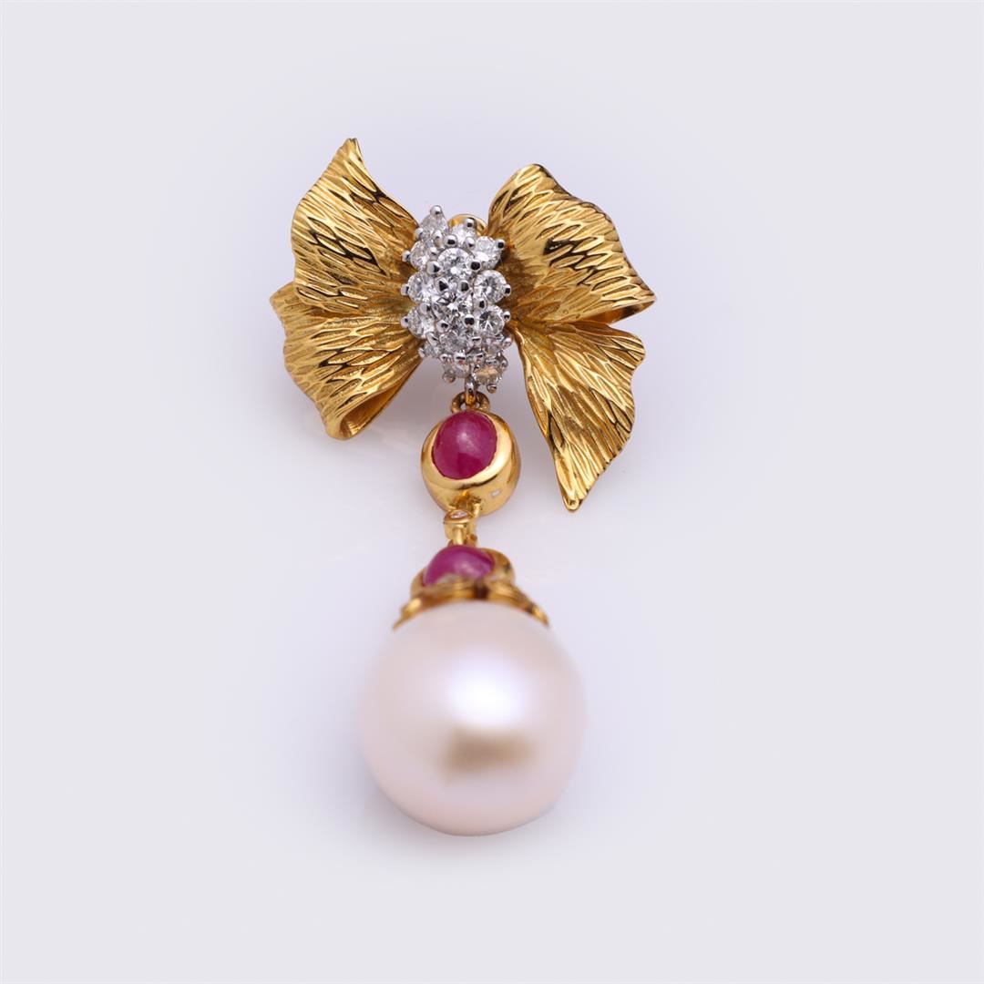 Pair 18K Yellow Gold, Ruby, Diamond & South Sea Pearl Earrings by Carlo Rici containing four oval rubies weighing approximately 1.0 cts. Forty-eight diamonds weighing approximately 0.80 cts. Total weight is 28.8 gm. Estimated retail value $7,900.