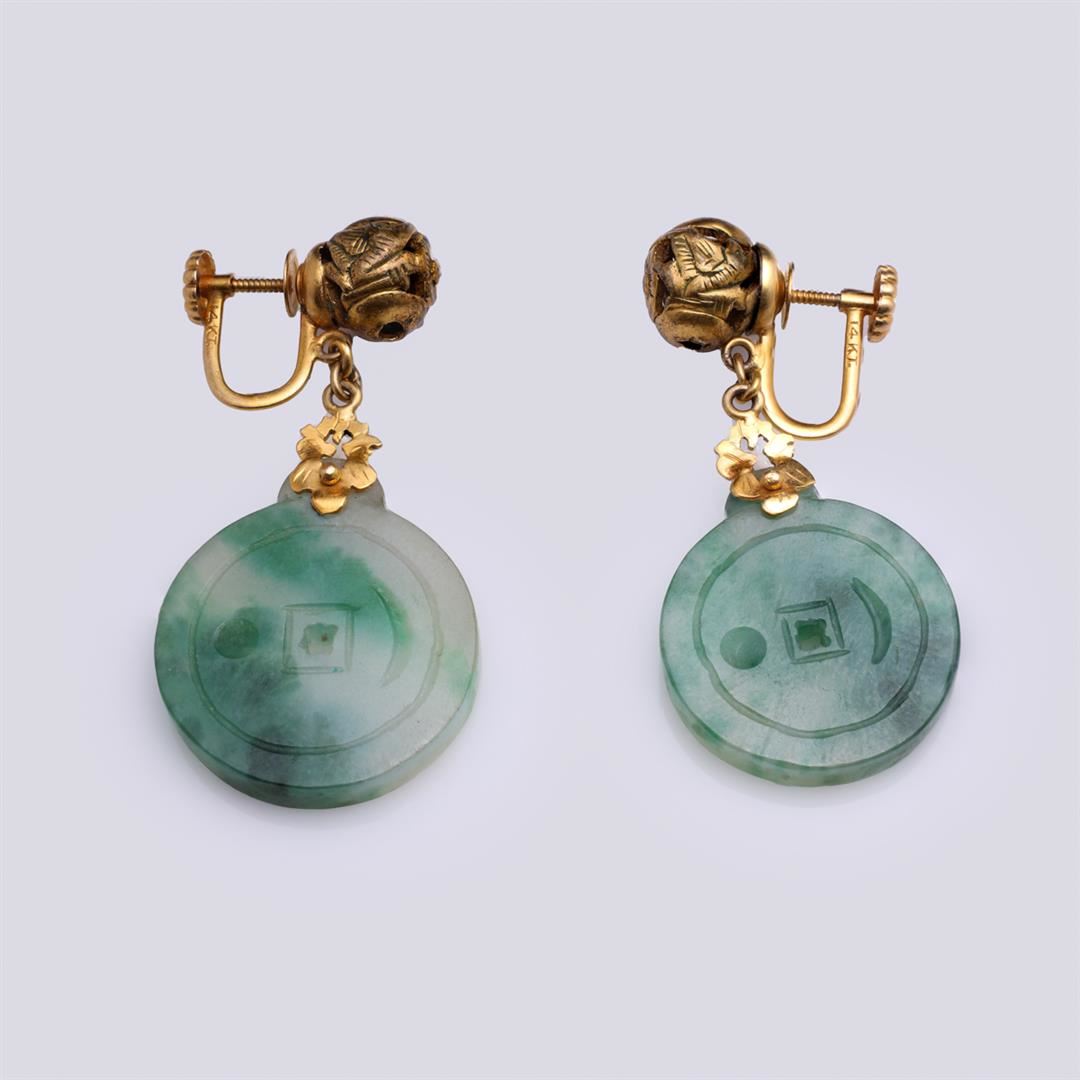 Pair of 14k Yellow Gold & Jadeite Earrings. Total weight is 10.7 gm. Estimated retail value $800.