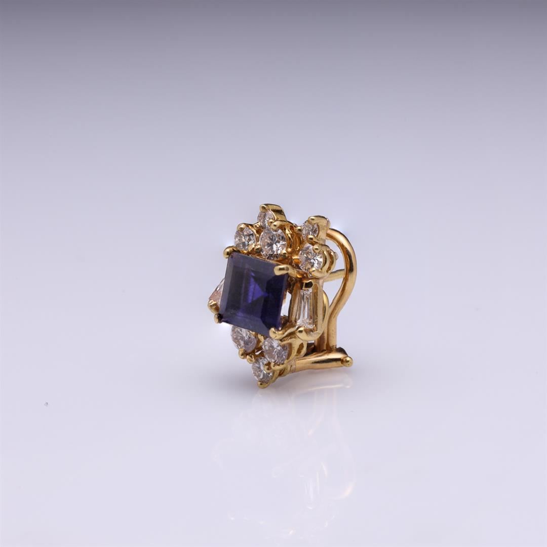 Pair of 18K Yellow Gold Iolite & Diamond Earrings containing two square cut iolite weighing approximately 0.20 cts. Twenty diamonds weighing approximately 1.50 cts. Total weight is 8.6 gm. Estimated retail value $3,900.