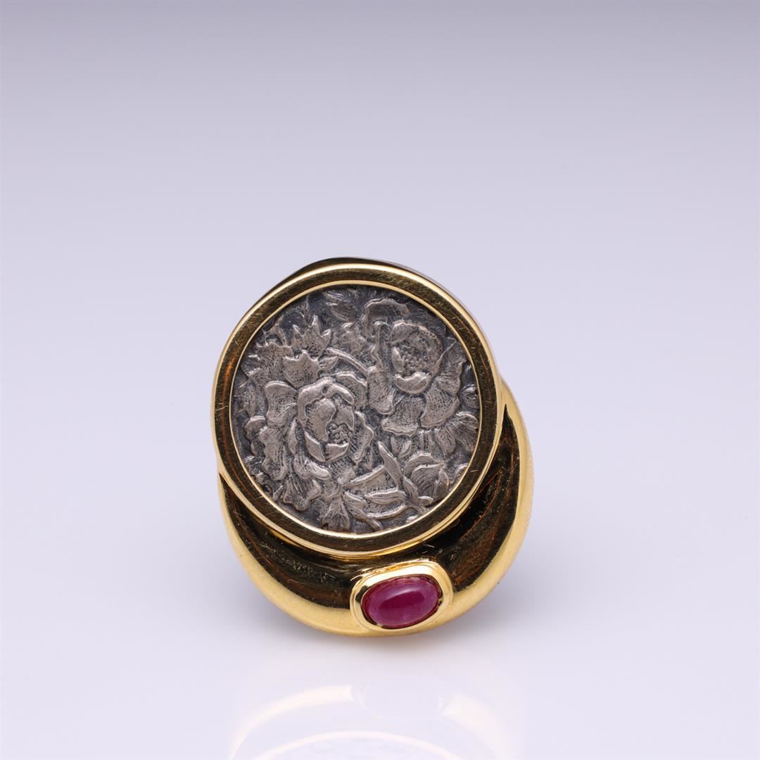 Pair of 18K Yellow Gold & Ruby Earrings with Sterling Silver Floral Medallions by R.L. Kay containing two oval cabochon rubies weighing approximately 0.40 cts. Total weight is 20 gm. Estimated retail value $3,000.