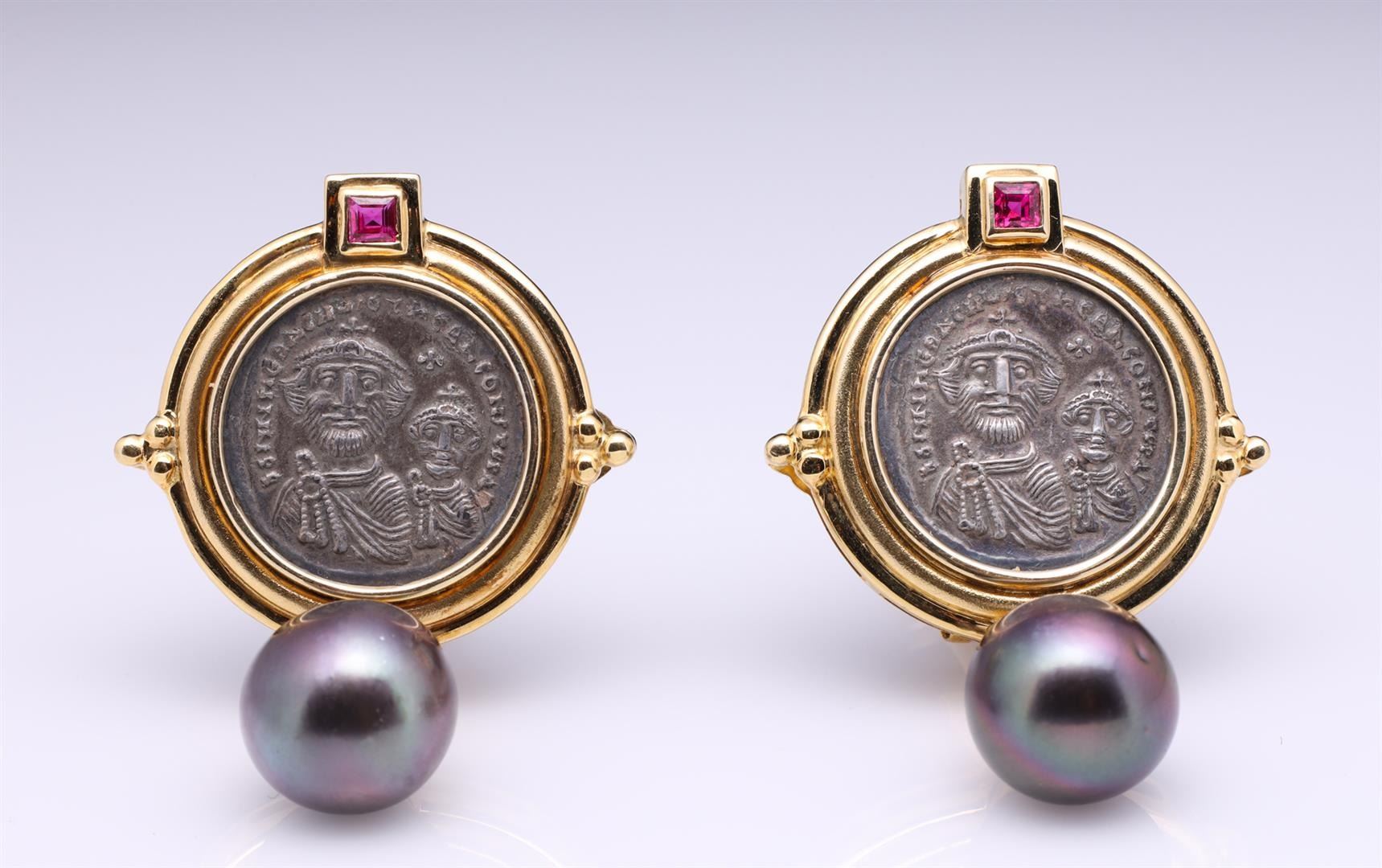 Pair of 18k Yellow Gold South Sea Black Pearl, Ruby & Byzantine Coin Earrings
