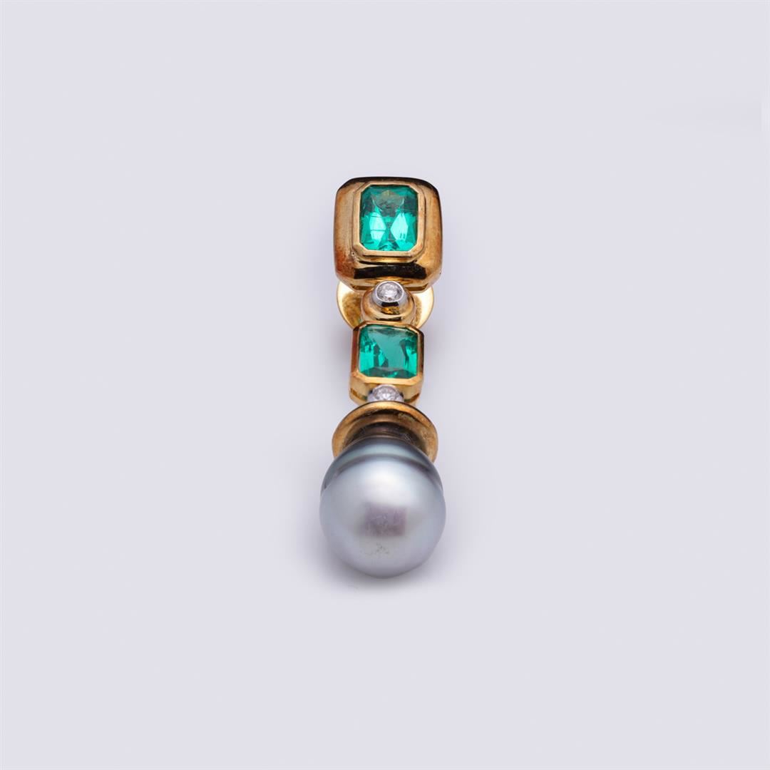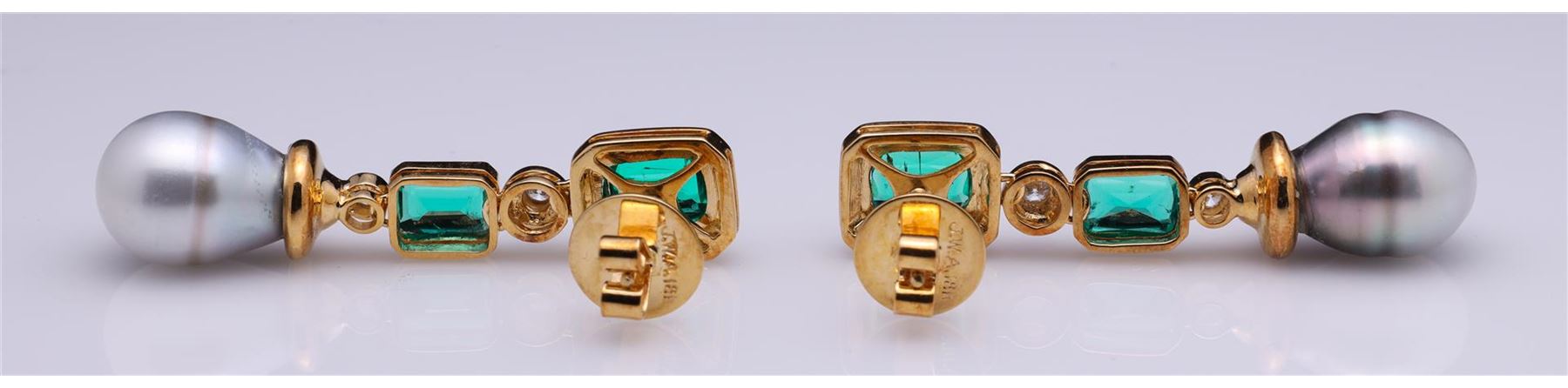 Pair of Elaborate 18K Yellow Gold South Sea Pearl, Diamond & Gilson Emerald earrings containing four round cut brilliant diamonds weighing approximately 0.20 cts. Total weight is 17.1 gm. Estimated retail value $5,000.