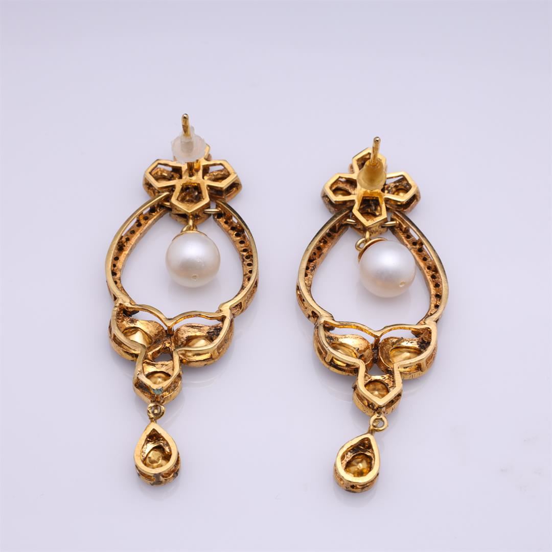 Pair of Mogul style silver topped gold earrings; each set with single pearl drop and numerous polki diamonds; gross weight 13.6 g, each 2 1/4" x 7/8" (approx.)