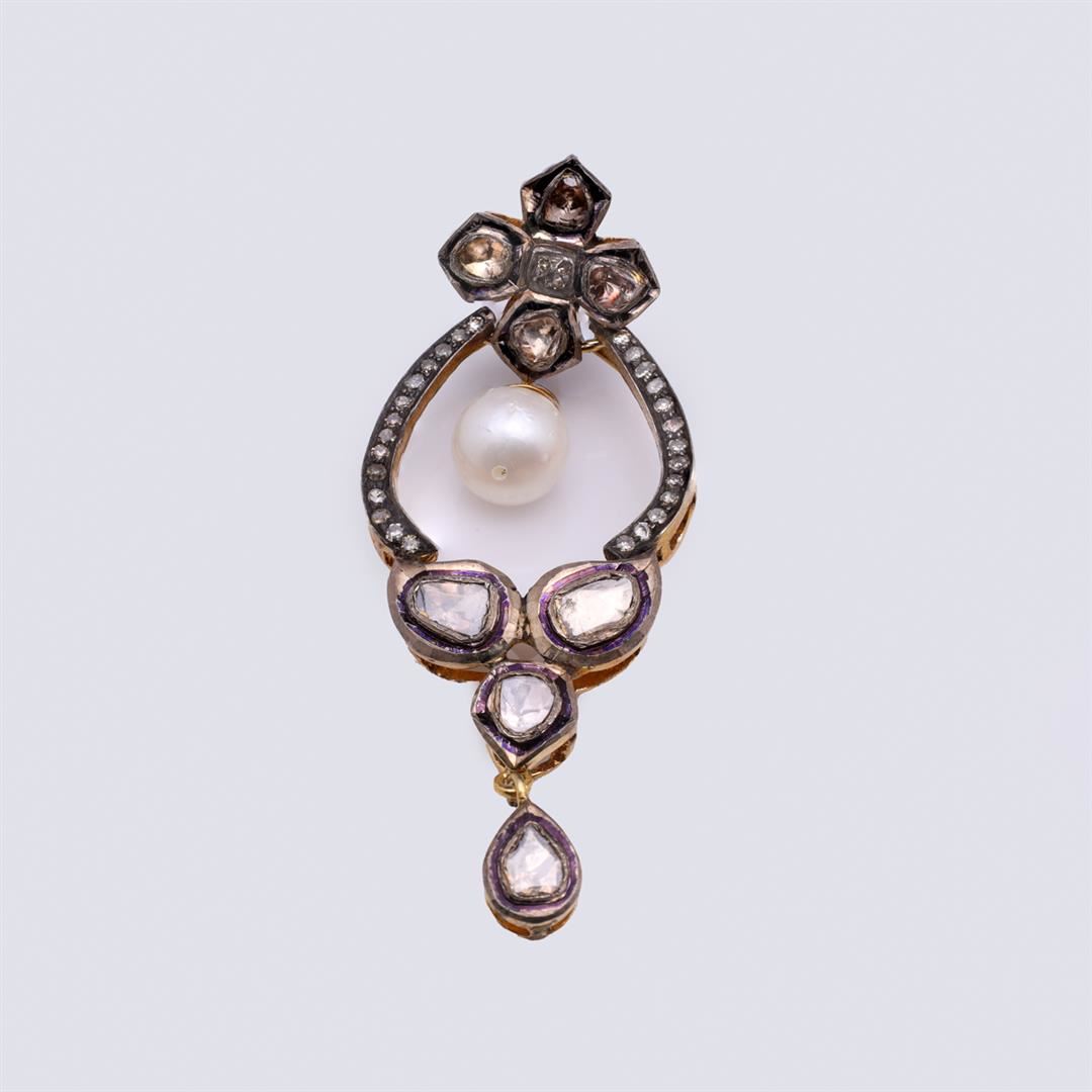 Pair of Mogul style silver topped gold earrings; each set with single pearl drop and numerous polki diamonds; gross weight 13.6 g, each 2 1/4" x 7/8" (approx.)