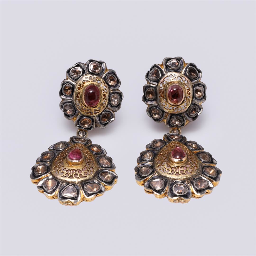 Pair of Mogul Style Silver Topped Gold Polki Diamond & Tourmaline Earrings containing diamonds and tourmaline weighing approximately 12.0 cts. Total weight is 24.8 gm. Estimated retail value $2,500.