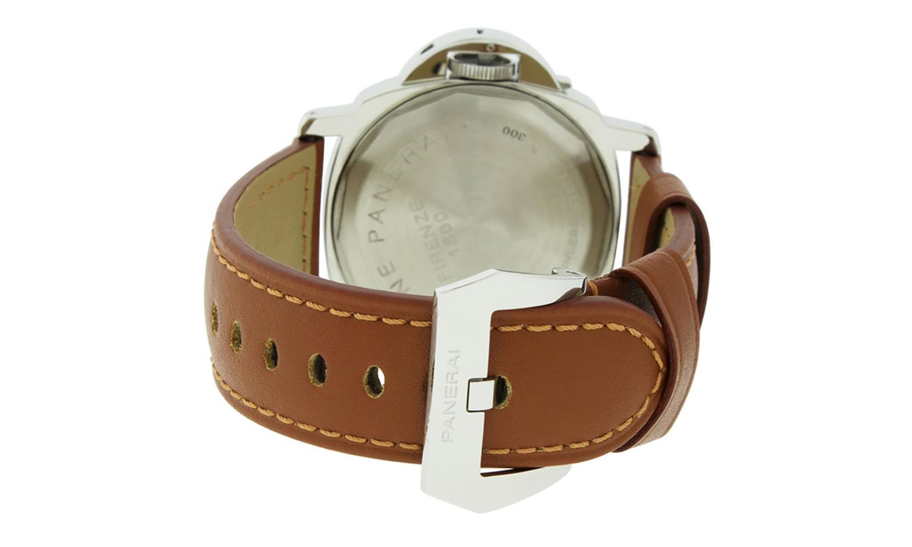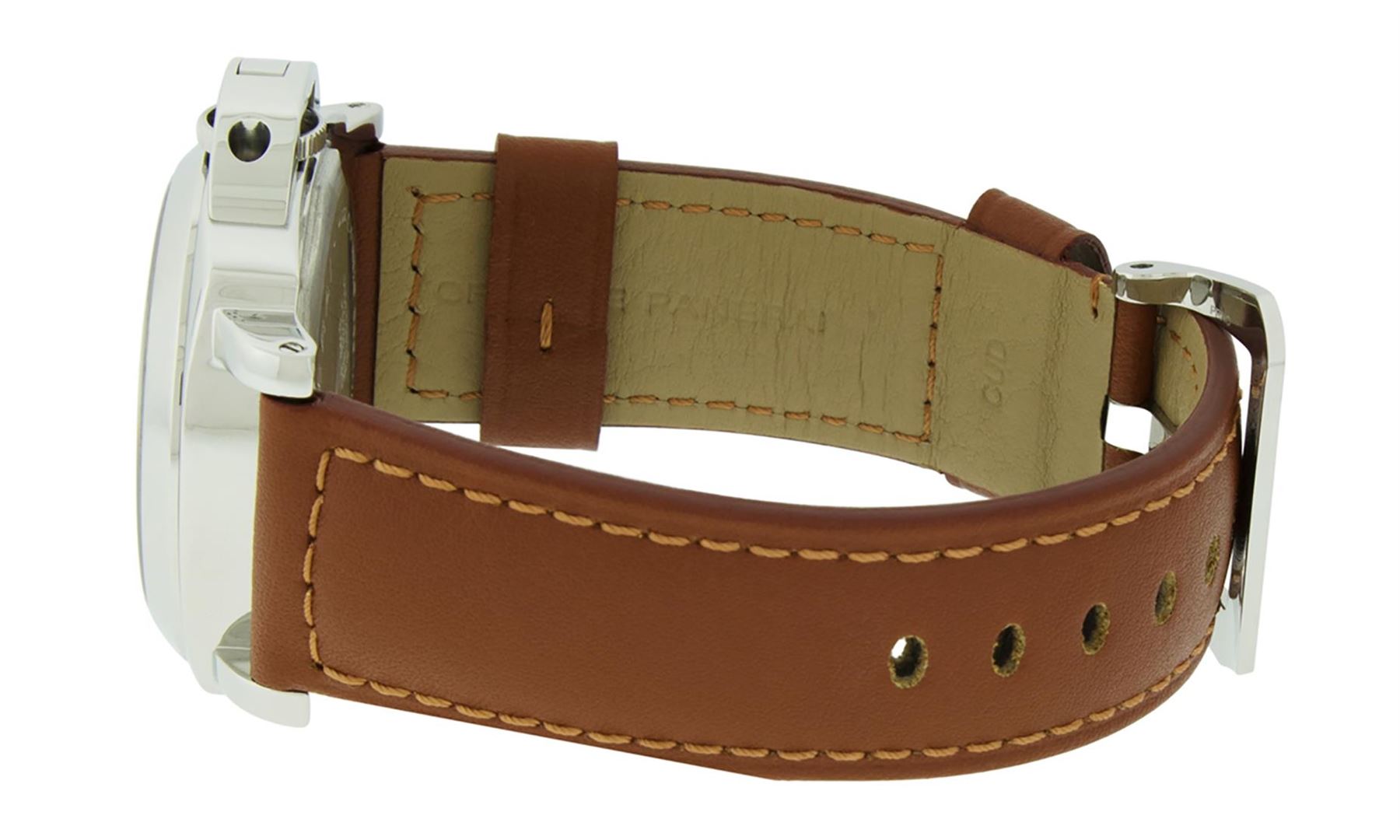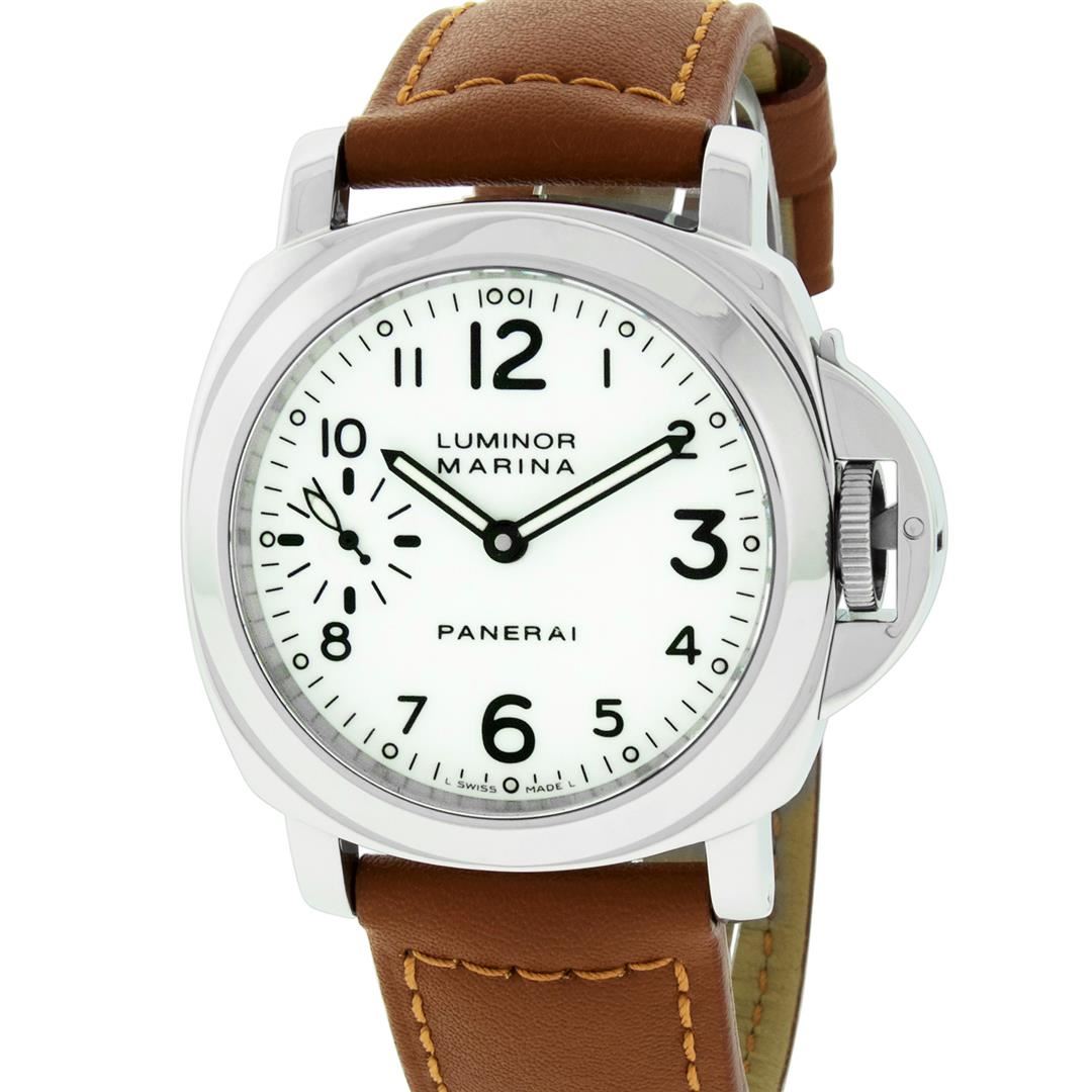 One Mens Panerai Mens Stainless Steel Luminor Polished bright, This Watch Has Been Serviced & Electronically Tested, Stainless Steel Case: 44mm, Stainless Steel Panerai Crown With Crown Protector. Bezel: Panerai Stainless Steel Smooth Bezel, Crystal: Sapphire Crystal. Hands: Panerai Luminiscent Hands, Movement: Manual Winding Movement Caliber 6497/2, Dial: Panerai White dial set with Arabic numeral hour markers and Lumi Dots, Functions: Seconds Subdial at 9 o'clock. Model: Panerai Marina. Condition: G-6 Extra Fine. Bracelet: Brand New Panerai Calf Brown Leather Strap, 8 Inch Length, Adjustable. Brand New Stainless Steel Tang (Pin) Buckle. This Watch Has Been Serviced Time Tested And Is In Excellent Condition, It Is Free Of All Scratches And Dents.This Watch Has A Brand New Panerai Buckle And Strap.