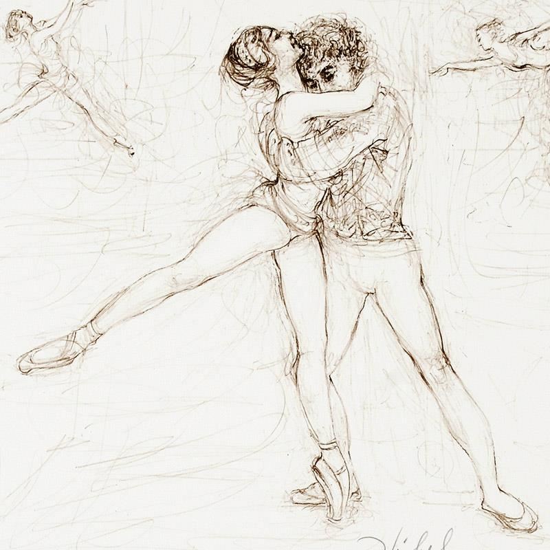 Wild lines and muted colors make Edna Hibel's art stand out in any room. "Pas de Deux" is a limited edition lithograph on paper, numbered and hand signed by Hibel (1917-2014). Includes Certificate of Authenticity! Measures approx. 12.5" x 15.5" (with border), 11" x 11" (image).