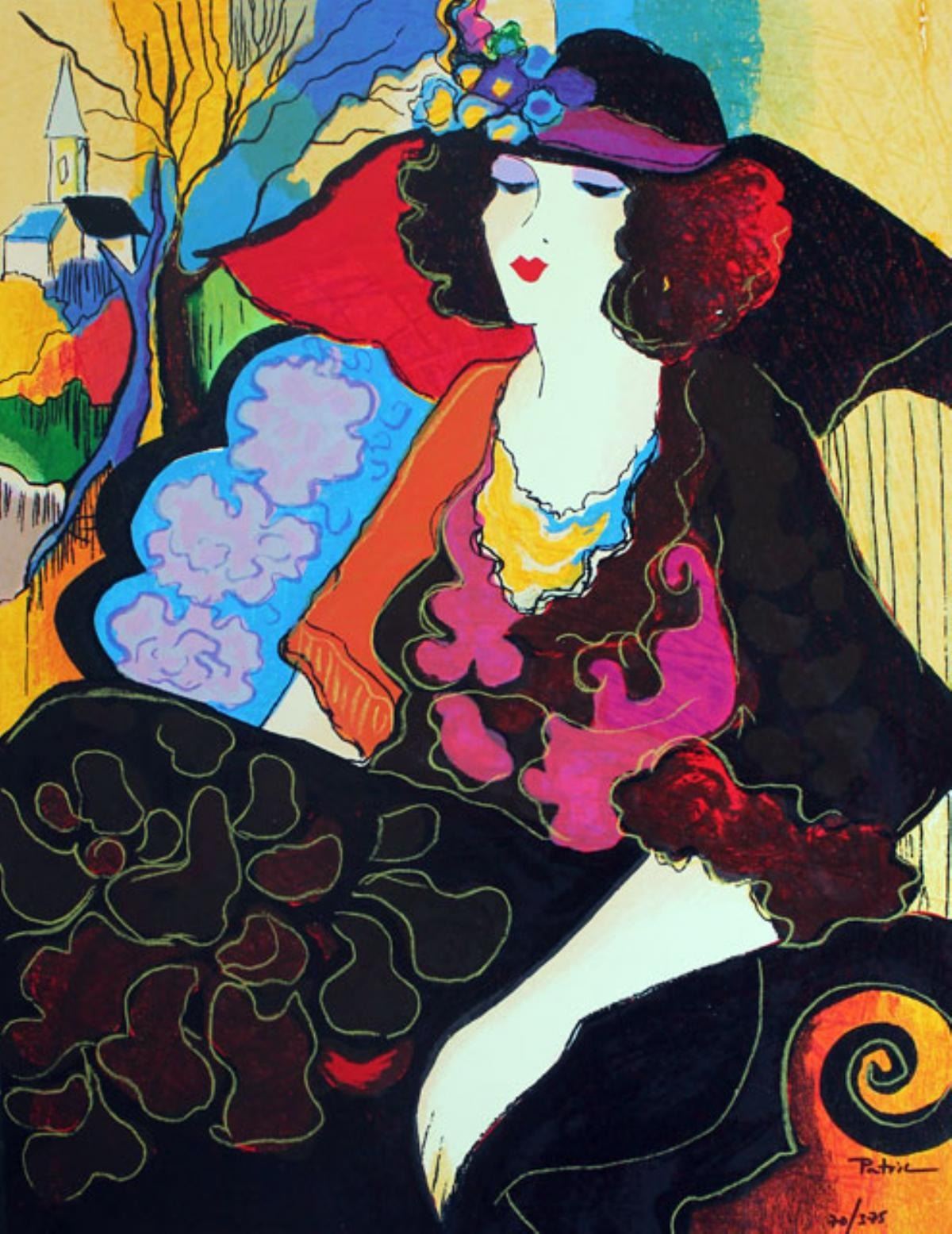 Artist: Patricia Govezensky - Title: Elizabeth - Medium: Serigraph on Fine Art Paper - Signature: Hand-signed by the Artist - Limited Edition: 375 - Image Size: Approximately 19.5 inches x 14.75 inches - Unframed - Details: This work comes with a Certificate of Authenticity - Patricia, a sensitive artist, brings to her canvas the immortal effeminate woman, combining her tender touch and simplicity with magic moments of beauty in delicate domain. She invites us to share the public intimacy of an informal French Cafe and the euphoric mystery of a woman?s room.