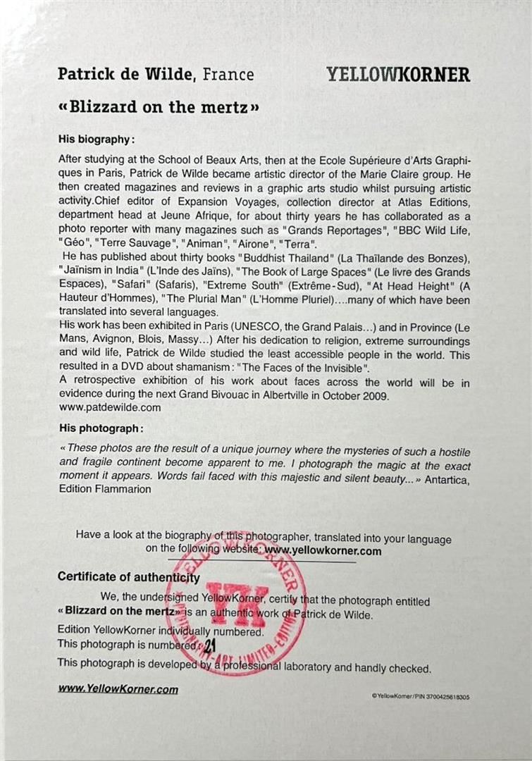 Patrick De Wilde France Blizzard on the Mertz YellowKorner Certified Photograph. Certificate of Authenticity from YellowKorner affixed to the back. Matted Dimensions 16"x20". Protected with Clear Mylar Sleeve.