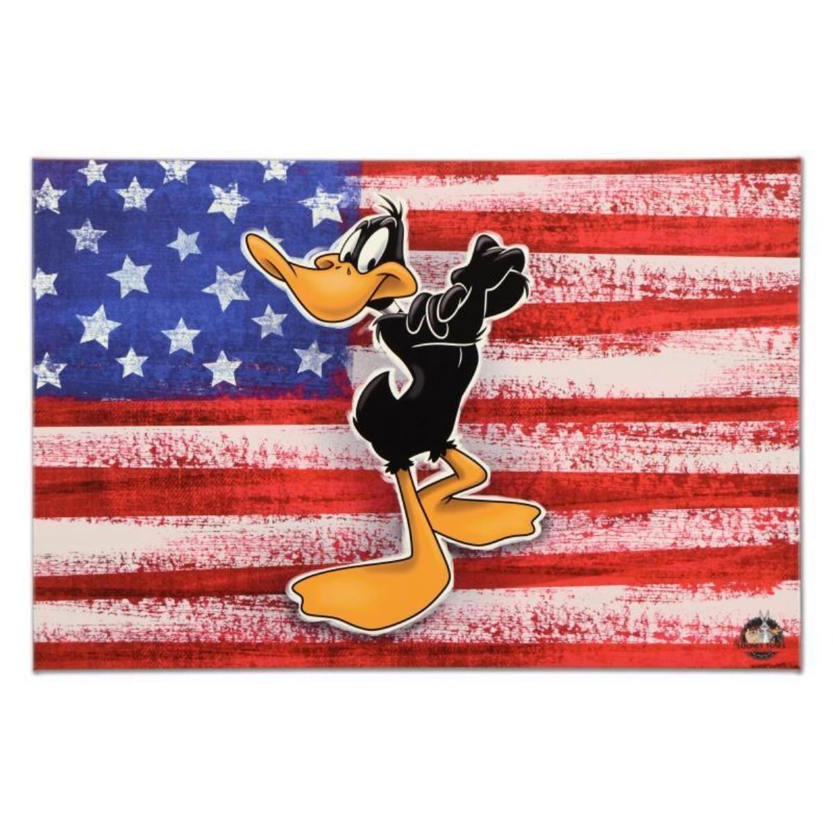 Patriotic Series: Daffy Duck by Looney Tunes. "Patriotic Series: Daffy Duck" is a limited edition giclee on gallery wrapped canvas by Looney Tunes. This piece comes from an edition of 250 and bears an imprint of Looney Tunes' official seal. Includes Certificate of Authenticity. Measures approx. 30" x 20" (image) This item requires special handling and may have a longer than usual turnaround.