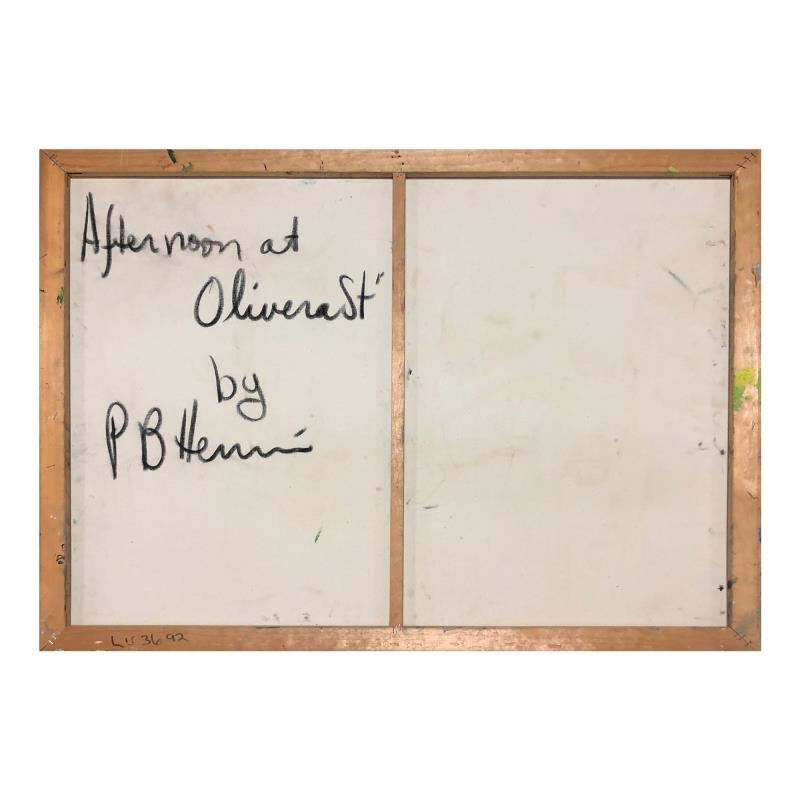 "Afternoon on Olivera St" is an original oil painting on stretched canvas by Paul Blaine Henrie (1932-1999). The piece is hand signed by the artist and comes with a letter of authenticity. Please note that due to the age of this piece and the way it was s