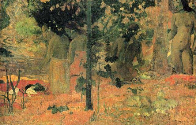 Artist: Paul Gauguin - Title: Badende - Medium: Fine Art Reproduction Giclee on Canvas - Image Size: Approximately 12.75 inches x 20 inches - Unframed on Unstretched Canvas - Biography: French post-impressionist artist Paul Gauguin was an important figure in the Symbolist art movement of the early 1900's. His use of bold colors, exaggerated body proportions and stark contrasts in his paintings set him apart from his contemporaries, helping pave the way for the Primitivism art movement. Gauguin often sought exotic environments and spent time living and painting in Tahiti.