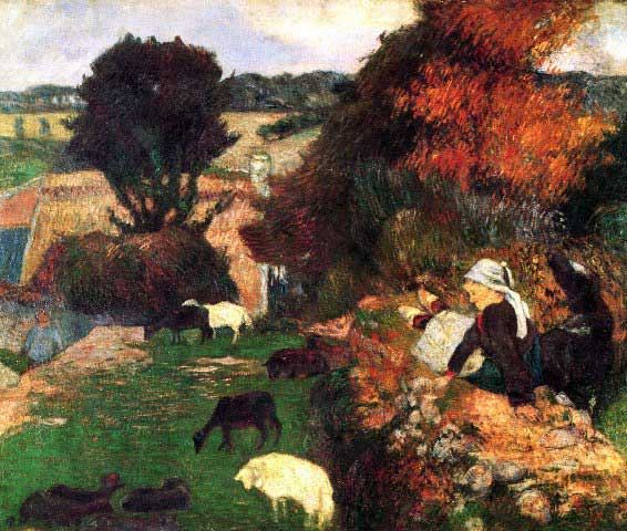 Artist: Paul Gauguin - Title: Breton Shepherds - Medium: Fine Art Reproduction Giclee on Canvas - Image Size: Approximately 17 inches x 20 inches - Unframed on Unstretched Canvas - Biography: French post-impressionist artist Paul Gauguin was an important figure in the Symbolist art movement of the early 1900's. His use of bold colors, exaggerated body proportions and stark contrasts in his paintings set him apart from his contemporaries, helping pave the way for the Primitivism art movement. Gauguin often sought exotic environments and spent time living and painting in Tahiti.
