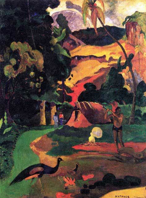 Artist: Paul Gauguin - Title: Landscape With Peacocks - Medium: Fine Art Reproduction Giclee on Canvas - Image Size: Approximately 20 inches x 14.75 inches - Unframed on Unstretched Canvas - Biography: French post-impressionist artist Paul Gauguin was an important figure in the Symbolist art movement of the early 1900's. His use of bold colors, exaggerated body proportions and stark contrasts in his paintings set him apart from his contemporaries, helping pave the way for the Primitivism art movement. Gauguin often sought exotic environments and spent time living and painting in Tahiti.