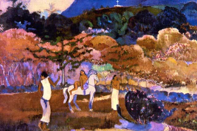 Artist: Paul Gauguin - Title: Woman and a White Horse - Medium: Fine Art Reproduction Giclee on Canvas - Image Size: Approximately 13.25 inches x 20 inches - Unframed on Unstretched Canvas - Biography: French post-impressionist artist Paul Gauguin was an important figure in the Symbolist art movement of the early 1900's. His use of bold colors, exaggerated body proportions and stark contrasts in his paintings set him apart from his contemporaries, helping pave the way for the Primitivism art movement. Gauguin often sought exotic environments and spent time living and painting in Tahiti.