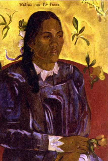 Artist: Paul Gauguin - Title: Woman with Gardenia - Medium: Fine Art Reproduction Giclee on Canvas - Image Size: Approximately 20 inches x 13.25 inches - Unframed on Unstretched Canvas - Biography: French post-impressionist artist Paul Gauguin was an important figure in the Symbolist art movement of the early 1900's. His use of bold colors, exaggerated body proportions and stark contrasts in his paintings set him apart from his contemporaries, helping pave the way for the Primitivism art movement. Gauguin often sought exotic environments and spent time living and painting in Tahiti.