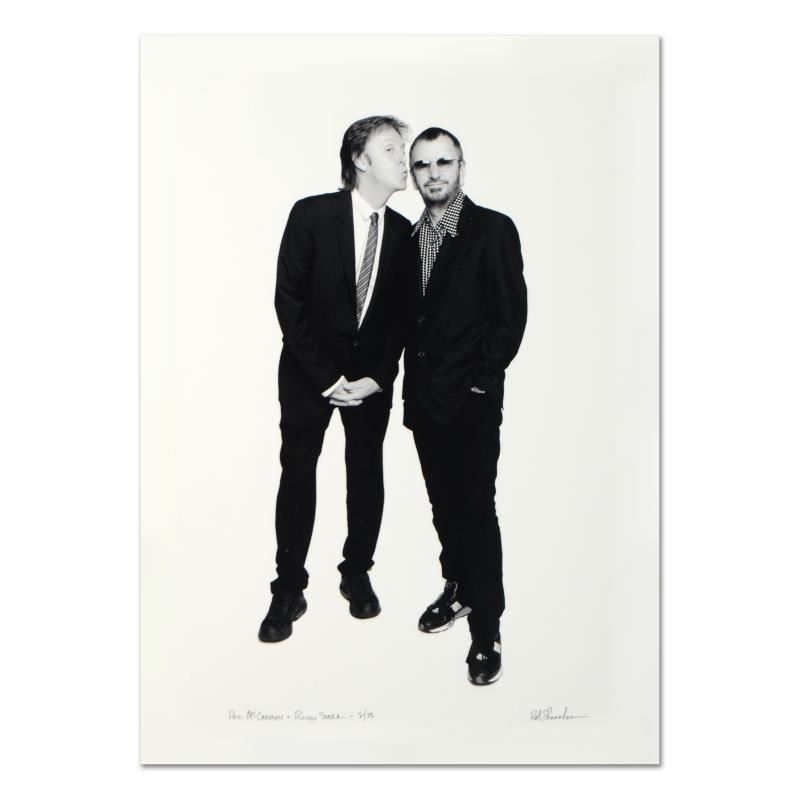 "Paul McCartney & Ringo Starr" is a limited edition giclee on paper, numbered and hand signed by acclaimed music industry photographer Rob Shanahan. Includes Certificate of Authenticity. Measures approximately 9" x 21" (image).