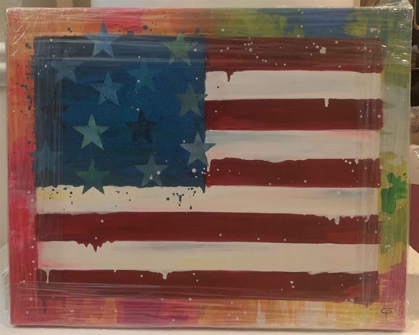 Paulina Del Mar "America Flag Blue" Original One of Kind Mixed Media Acrylic on Stretched Canvas, Hand Signed Dimensions: 16 x 20 inches
