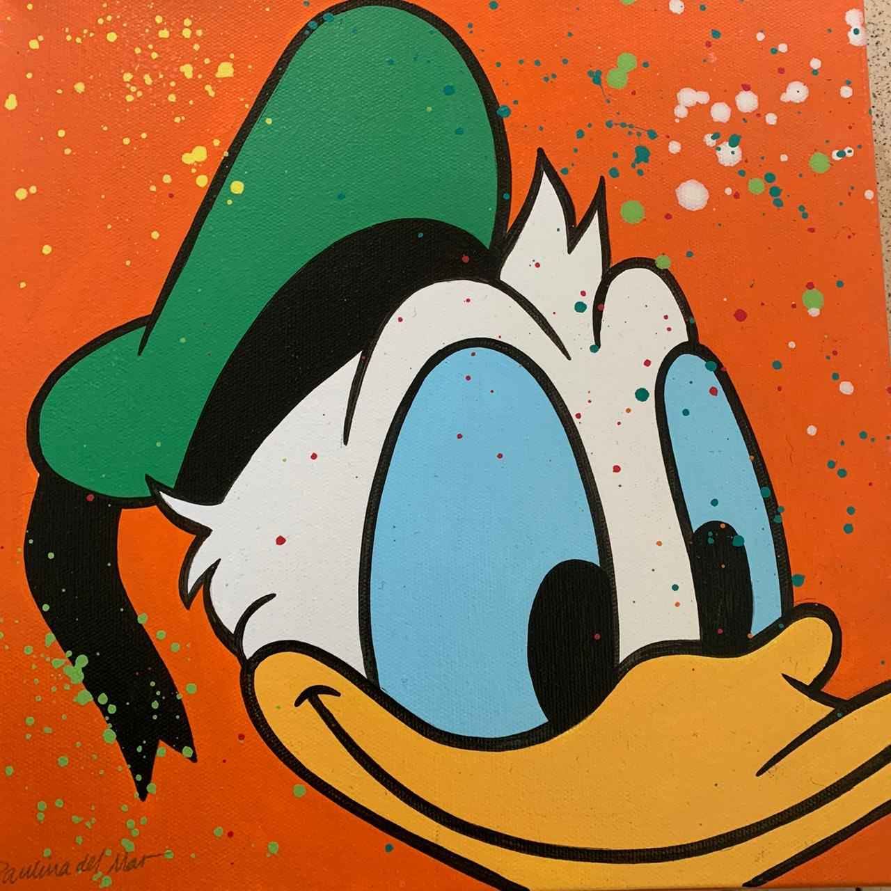 Paulina Del Mar "Donald Duck in Orange" Original One of Kind Mixed Media Acrylic on Stretched Canvas, Hand Signed Dimensions: 12 x 12 inches