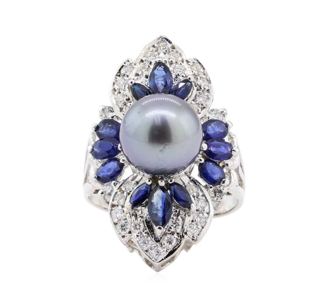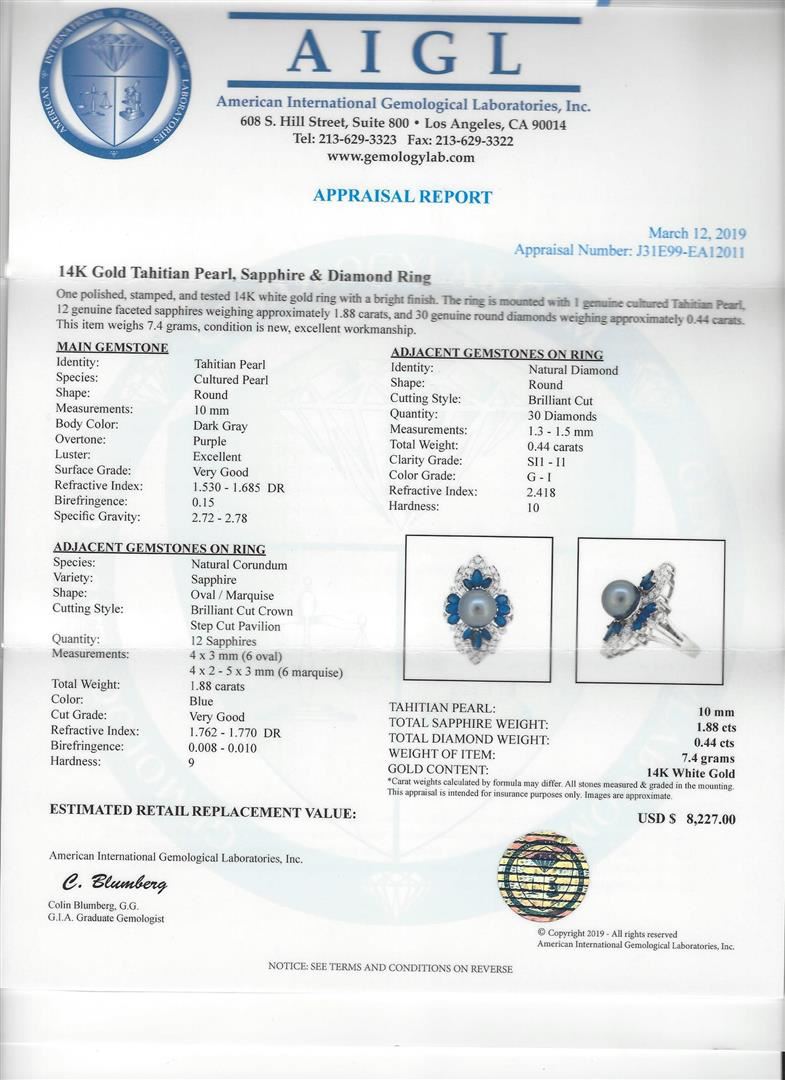 One Polished, stamped , and tested 14K white gold ring with a bright finish. The ring is mounted with 1 genuine cultured Tahitian Pearl, 12 genuine sapphires weighing approximately 1.88 carats, and 30 genuine round diamonds weighing approximately 0.44 carats. This item weighs 7.4 grams, condition is new, excellent workmanship. MAIN GEMSTONE Identity: Tahitian Pearl Species: Cultured Pearl Shape: Round Measurements: 10 mm Body Color: Dark Gray Overtone: Purple Luster: Excellent Surface Grade: Very Good Refractive Index: 1,530 - 1.685 DR Birefringence: 0.15 Speci?c Gravity: 2.72 - 2.78 ADJACENT GEMSTONE ON RING Identity: Natural Diamond Shape: Round Cutting Style: Brilliant Cut Quantity: 30 Diamonds Measurements: 1.3 - 1.5 mm Total Weight: 0.44 carats Clarity Grade: S11 - I1 Color Grade: G - I Refractive Index: 2.418 Hardness: 10 ADJACENT GEMSTONES ON RING Species: Natural Corundum Variety: Sapphire Shape: Oval / Marquise Cutting Style: Brilliant Cut Crown Step Cut Pavilion Quantity: 12 Sapphires Measurements: 4 x 3 mm (6 oval) 4 x 2 - 5 x 3 mm (6 marquise) Total Weight: 1.88 carats Color: Blue Cut Grade: Very Good Refractive Index: 1.762 - 1.770 DR Birefringence: 0.008 - 0.010 Hardness: 9 TAHITIAN PEARL: 10 mm TOTAL SAPPHIRE WEIGHT: 1.88 cts TOTAL DIAMOND WEIGHT: 0.44 cts WEIGHT OF ITEM: 7.4 grams GOLD CONTENT: 14K White Gold ESTIMATED RETAIL REPLACEMENT VALUE: USD S 8,227.00